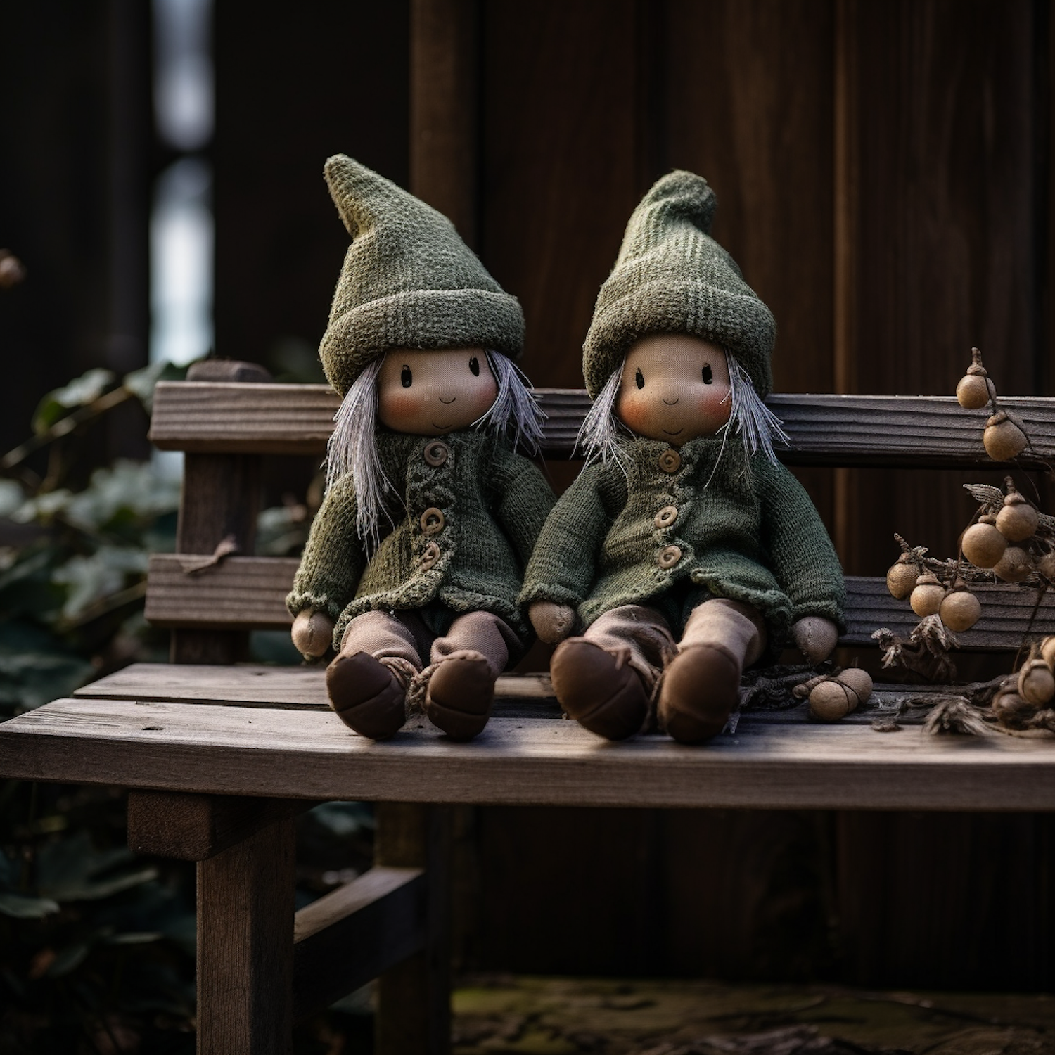 Two whimsical dolls in green knitted outfits sit on a rustic bench, surrounded by dried plants, creating a cozy, nostalgic scene.