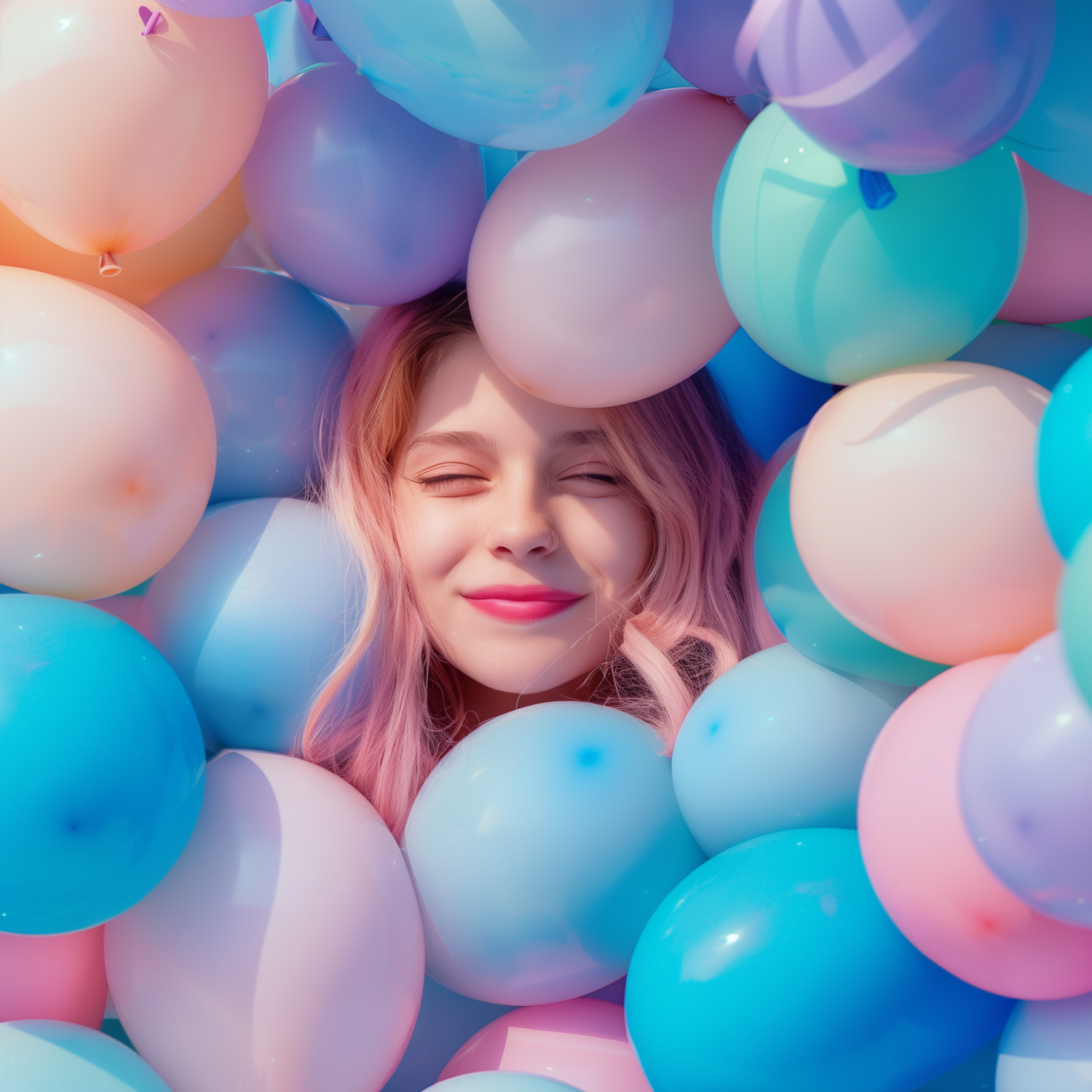 A young woman with pink hair surrounded by pastel balloons, eyes closed in serene contentment, under soft sunlight.