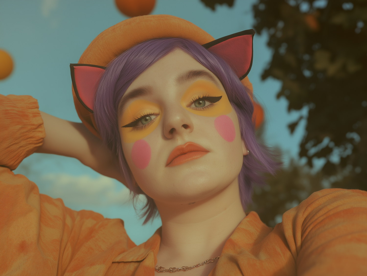 A young woman with purple hair and playful makeup poses outdoors, wearing an orange hat with cat ears against a blue sky.