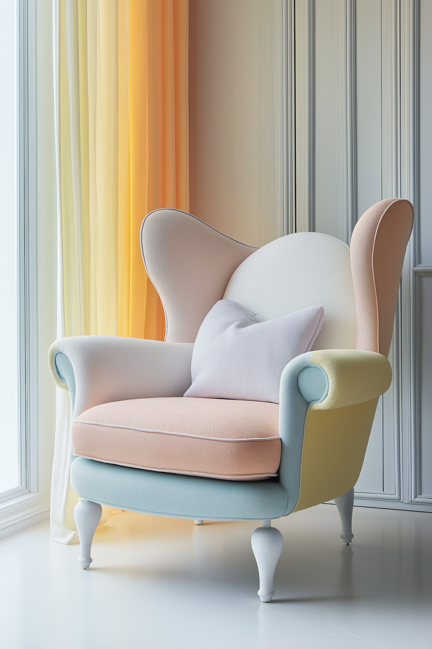 Pastel armchair with high back and rounded armrests in a bright room with sheer yellow curtains and natural light.