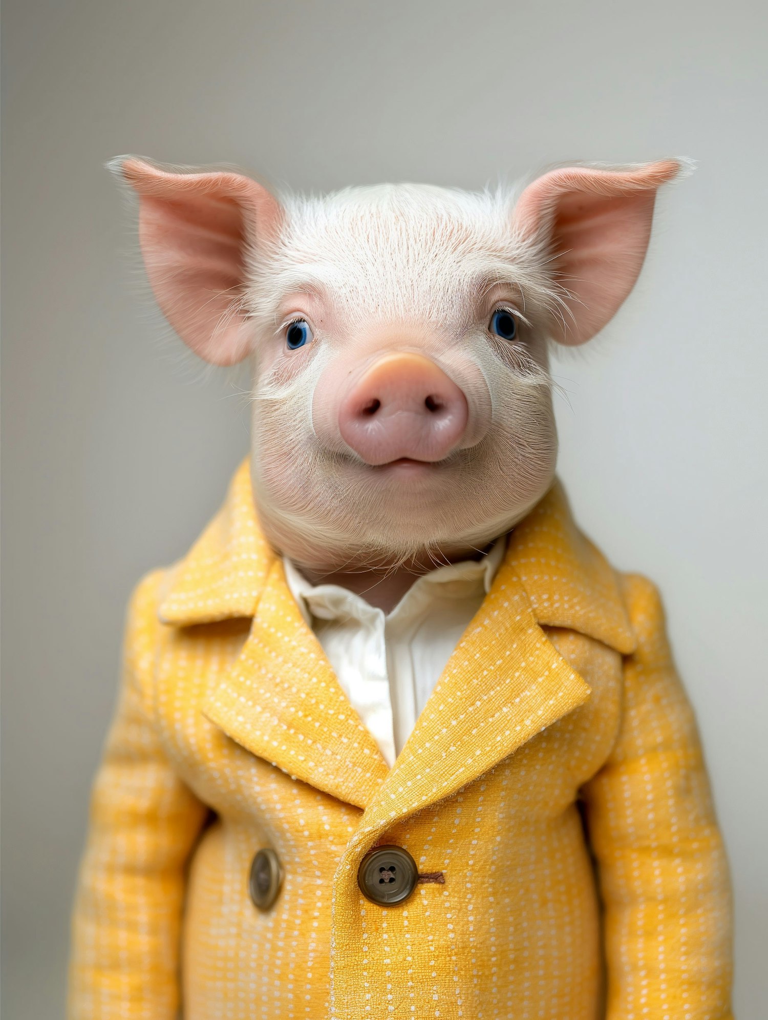 Adorable piglet in a yellow coat with blue eyes, standing upright against a neutral background.