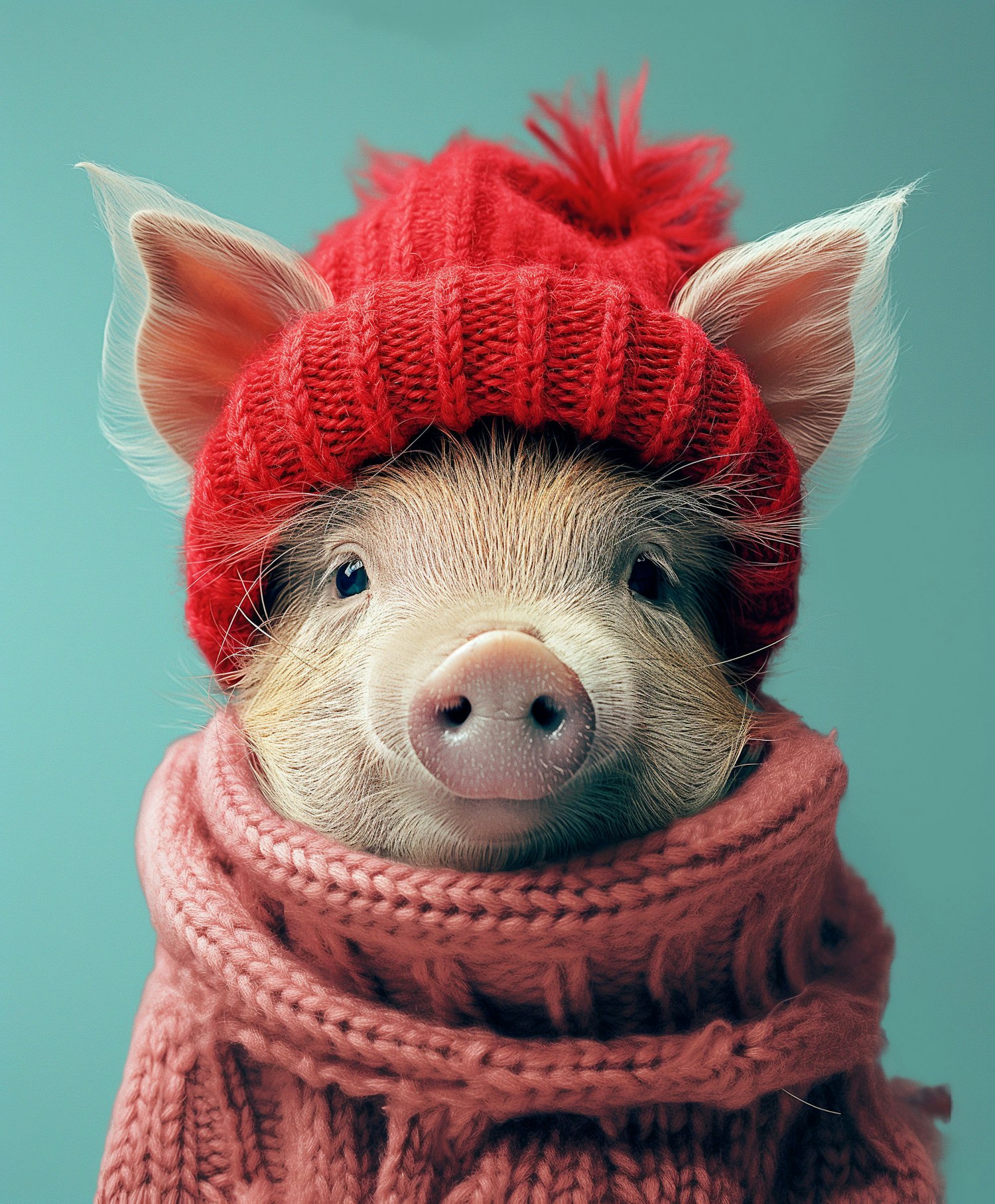 Adorable piglet in a red knit hat and pink scarf against a teal background, exuding warmth and charm.
