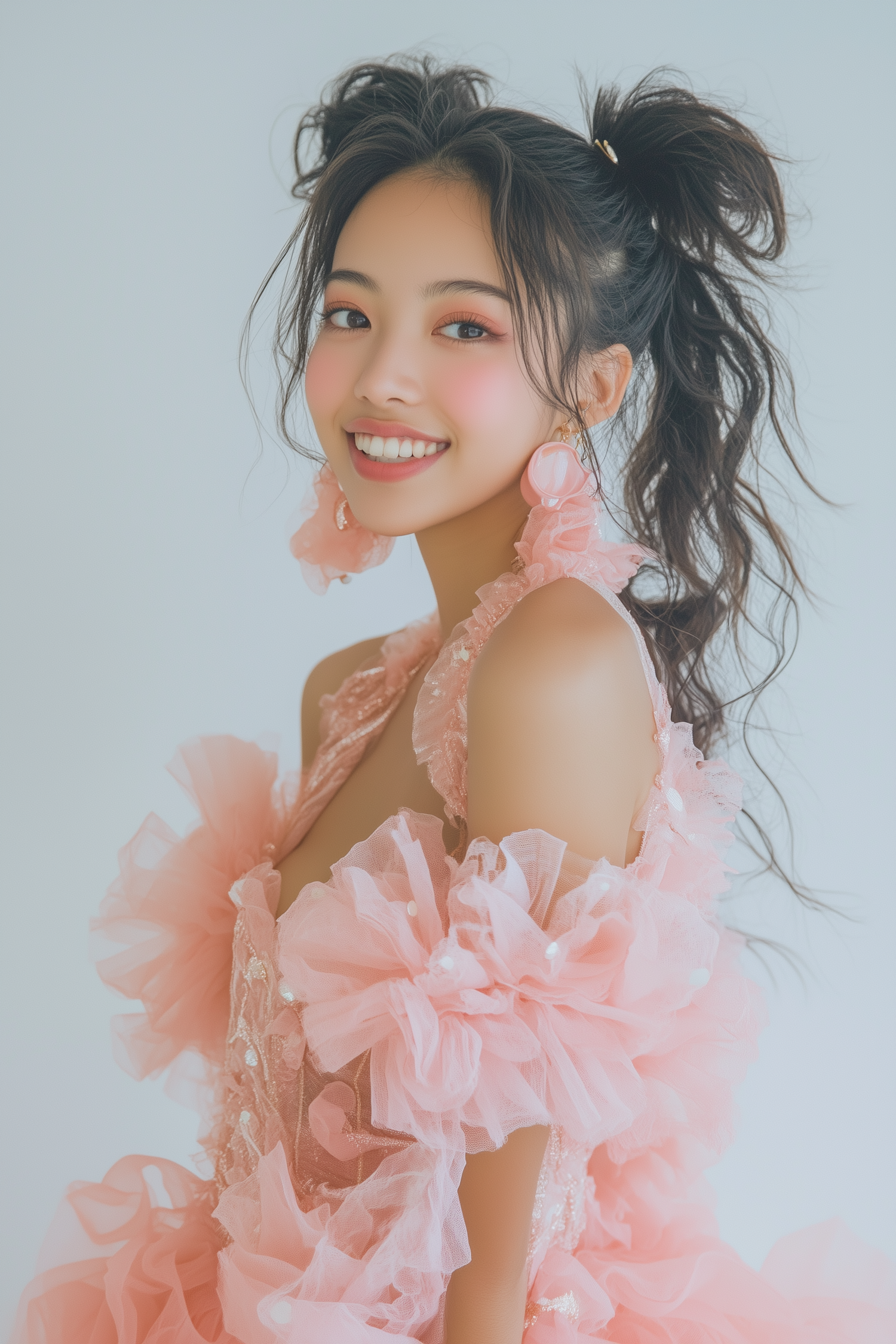 A cheerful woman in a pink tulle dress with twin ponytails and floral earrings, radiating playful elegance against a light blue background.