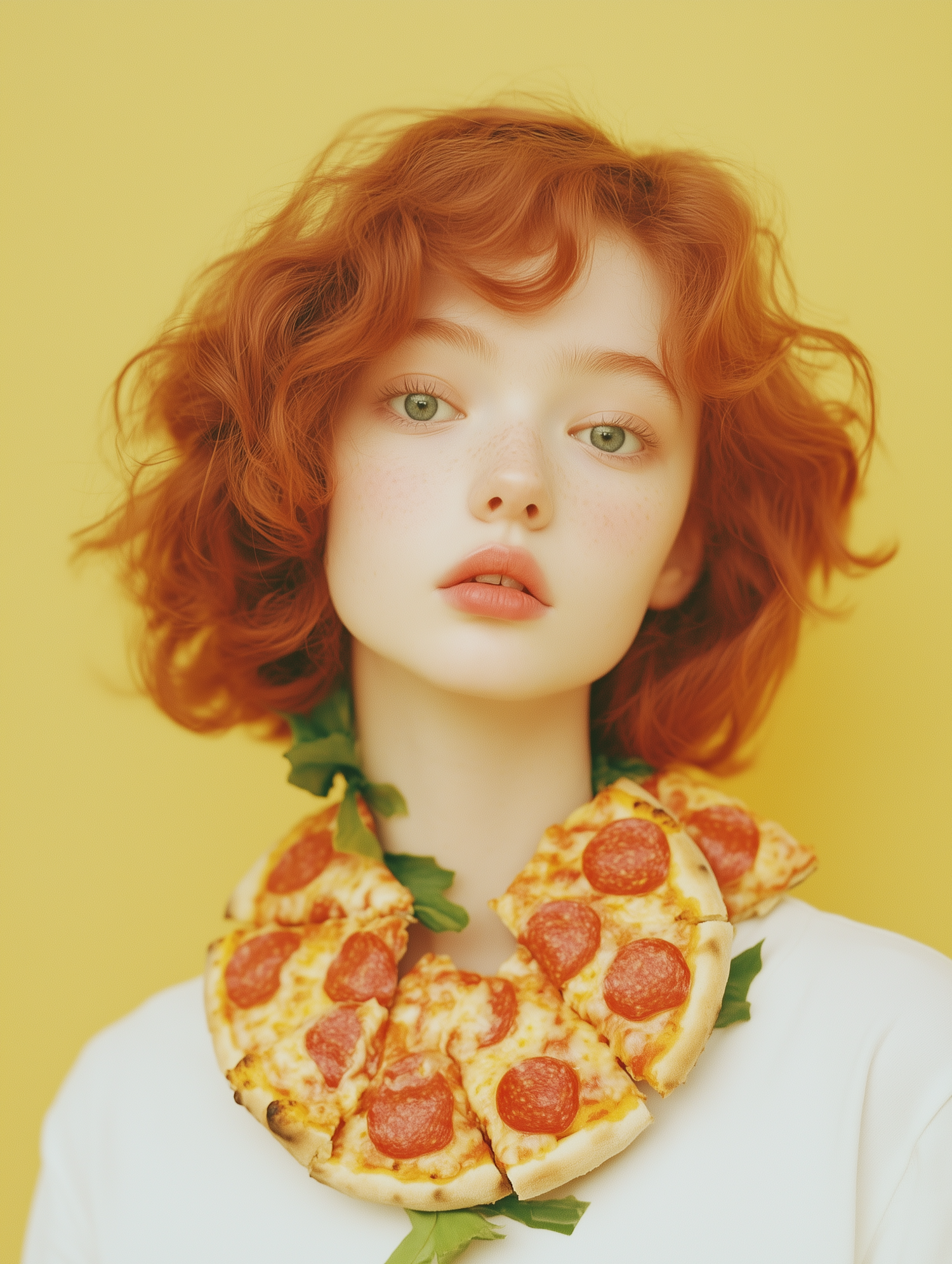 A whimsical portrait of a red-haired woman wearing a pizza slice necklace, set against a vibrant yellow background.