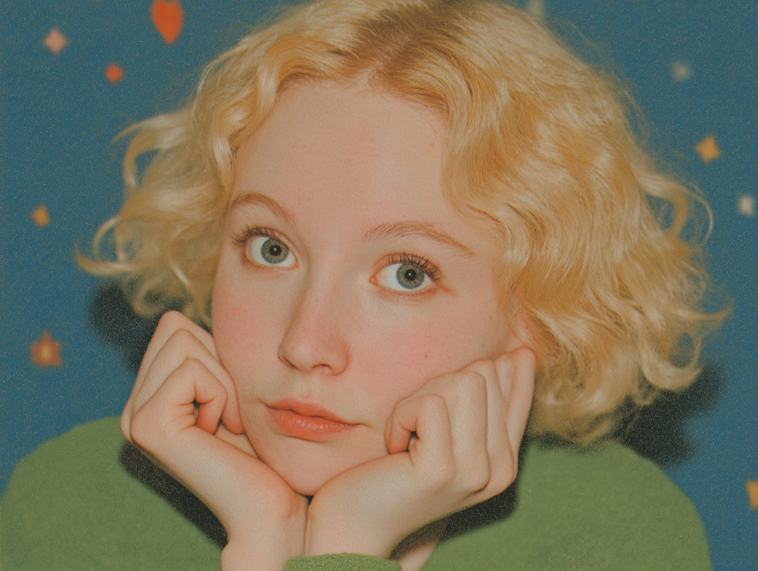A portrait of a person with blonde curls and a green top against a blue background with star and heart patterns.