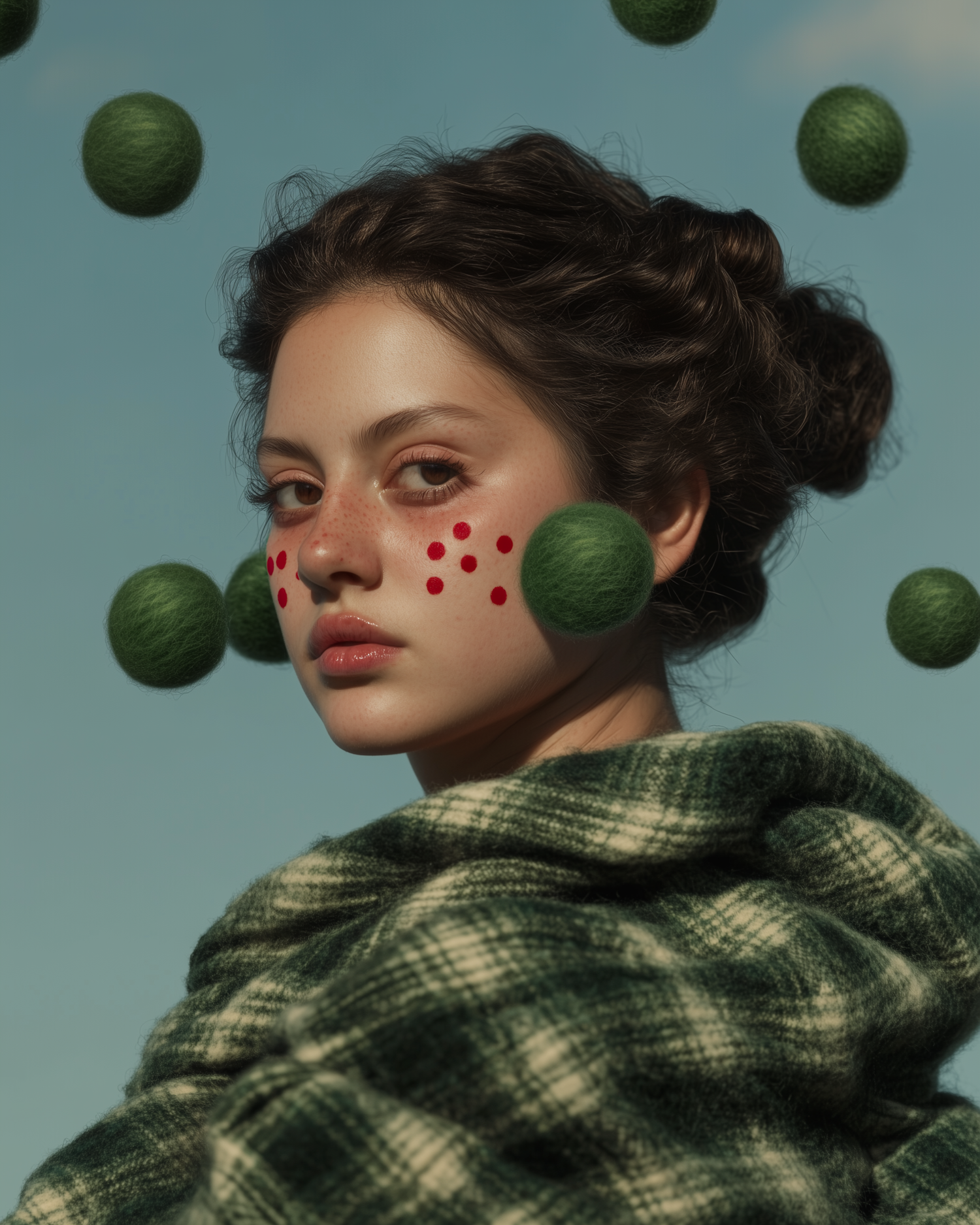 A surreal portrait of a woman with red polka dots on her cheeks, green woolen spheres, and a plaid wrap against a blue sky.