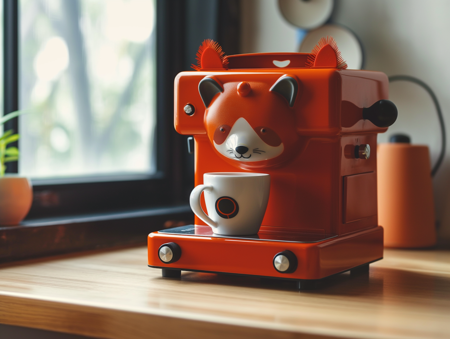 Adorable orange espresso machine styled like a red panda, with a cozy kitchen setup featuring a coffee cup and natural light.