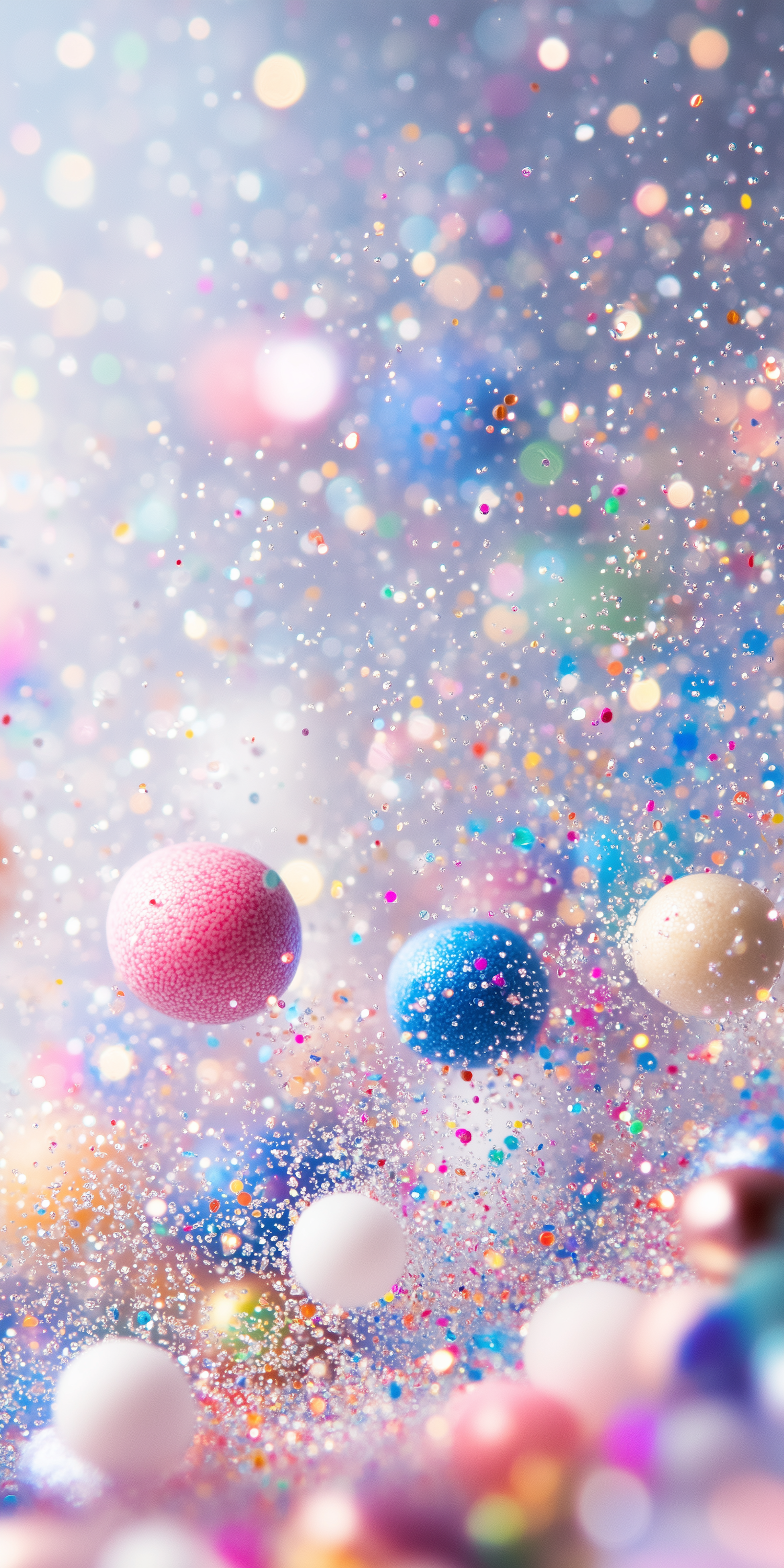 Colorful spheres and glittering confetti create a magical, festive scene with soft bokeh lights and a dreamy, celebratory vibe.