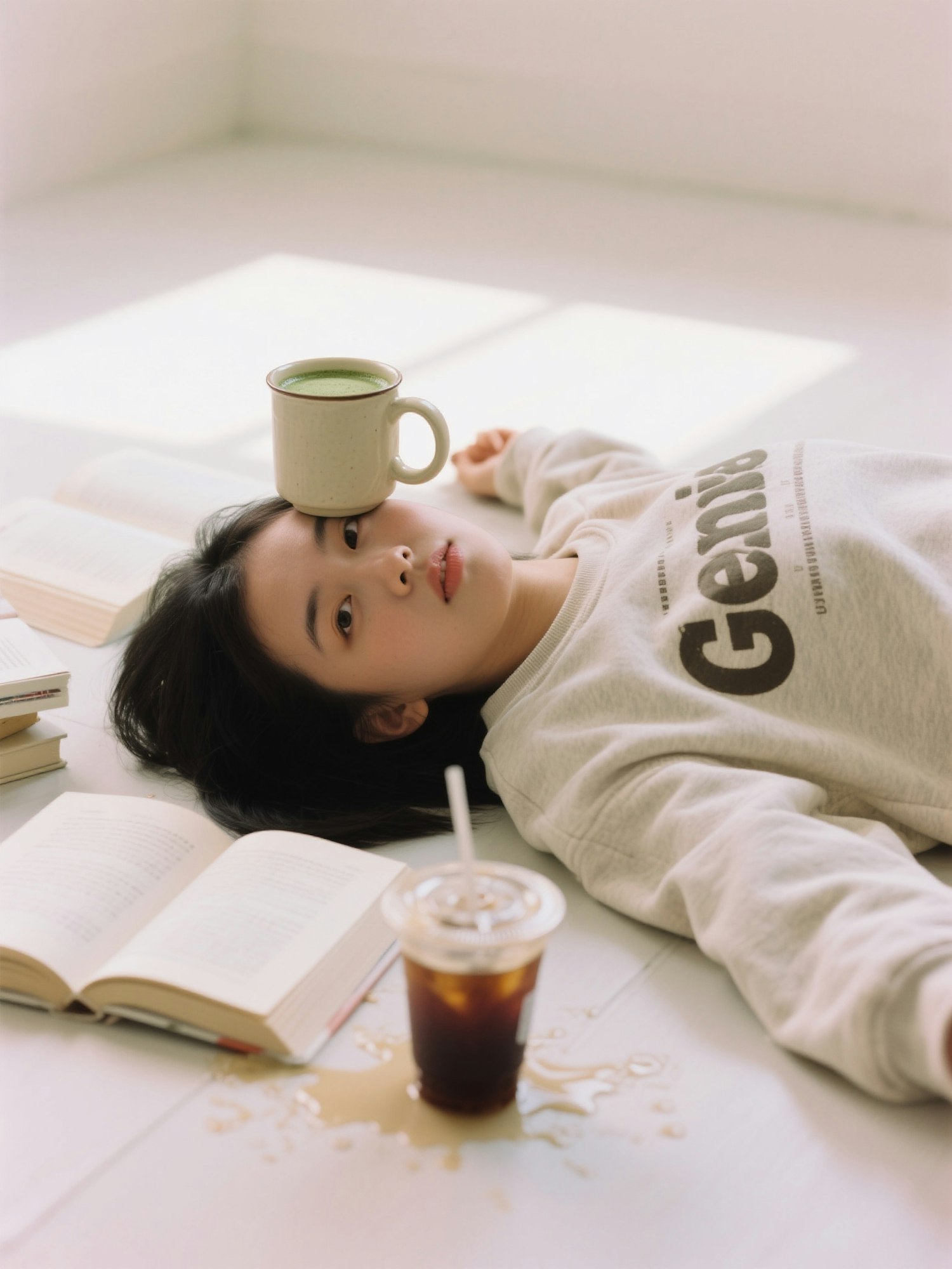 A serene scene of a young woman lying on the floor with books, a spilled iced coffee, and a mug balanced on her forehead.