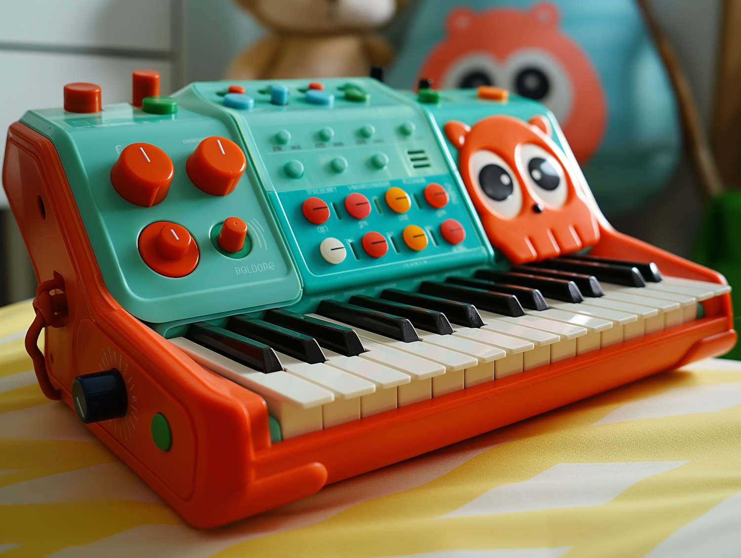 Vibrant toy keyboard with colorful buttons and an owl design, perfect for kids' musical exploration and play.