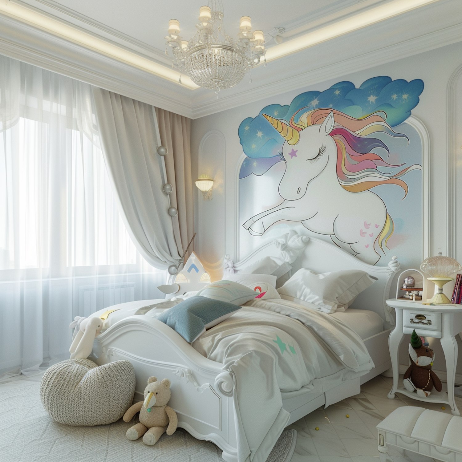 Charming children's bedroom with unicorn mural, plush toys, and elegant chandelier. Soft pastel colors create a whimsical atmosphere.
