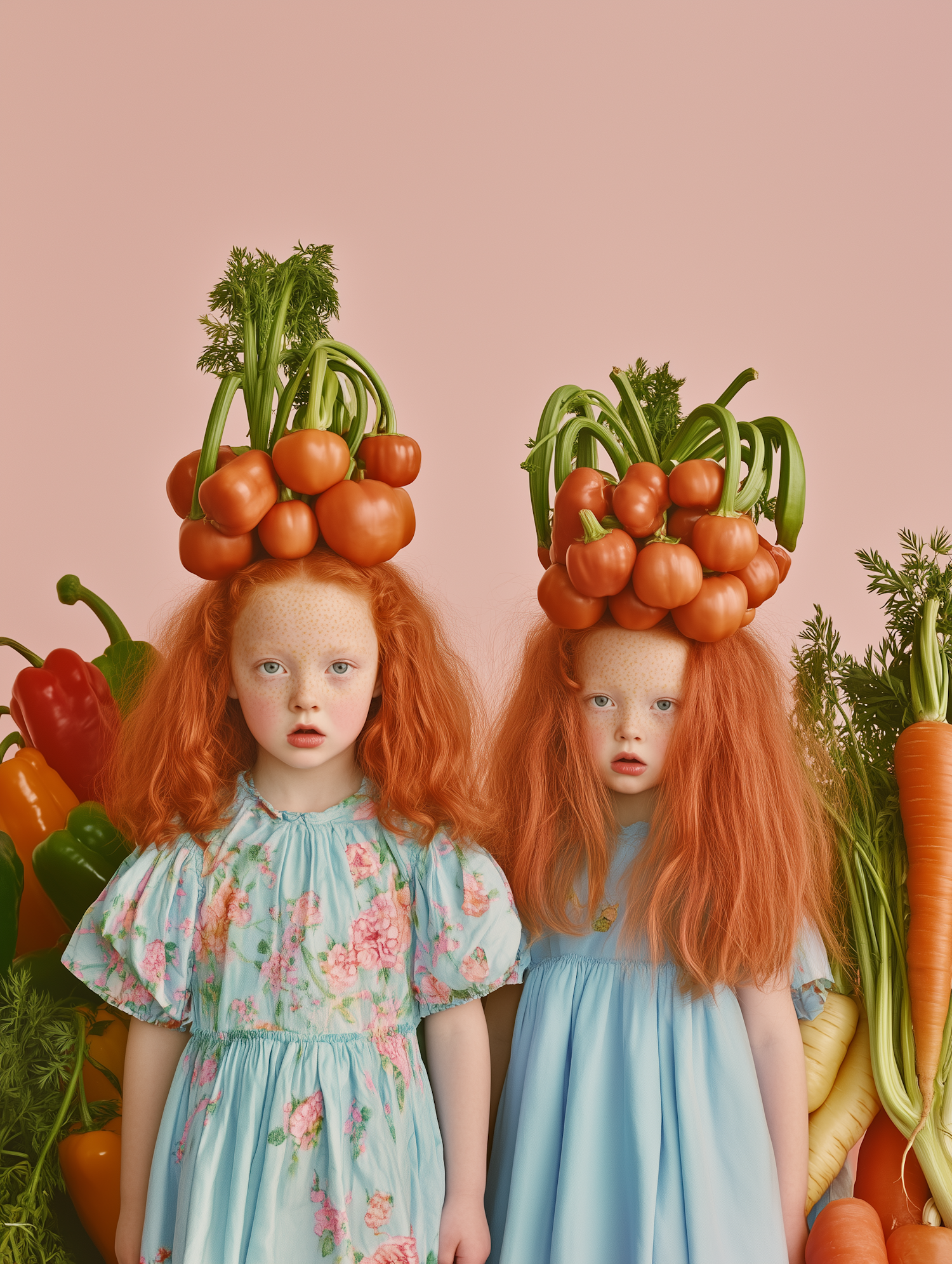 Two red-haired girls in blue dresses wear vegetable headpieces, surrounded by vibrant carrots and peppers against a peach background.