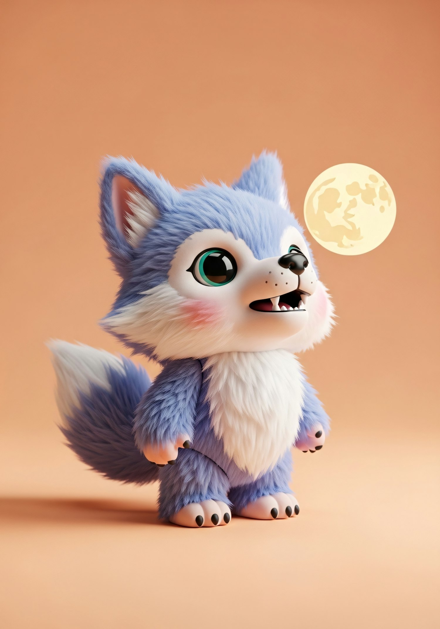 Adorable 3D-rendered wolf-like character with fluffy blue fur and a glowing moon in a warm peach background.