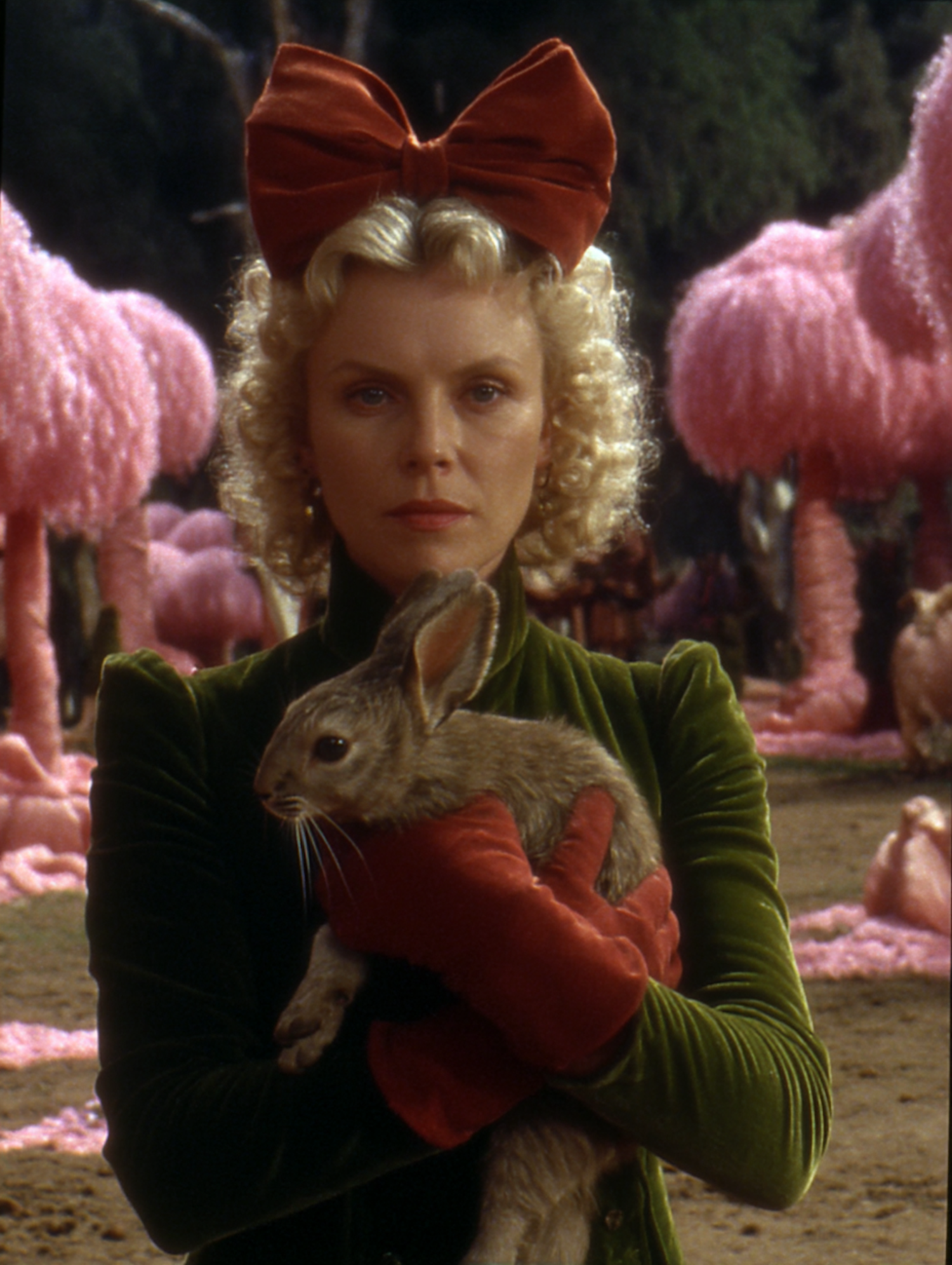 A woman in a green velvet jacket and red bow holds a rabbit in a surreal setting with pink, fluffy trees and whimsical lighting.