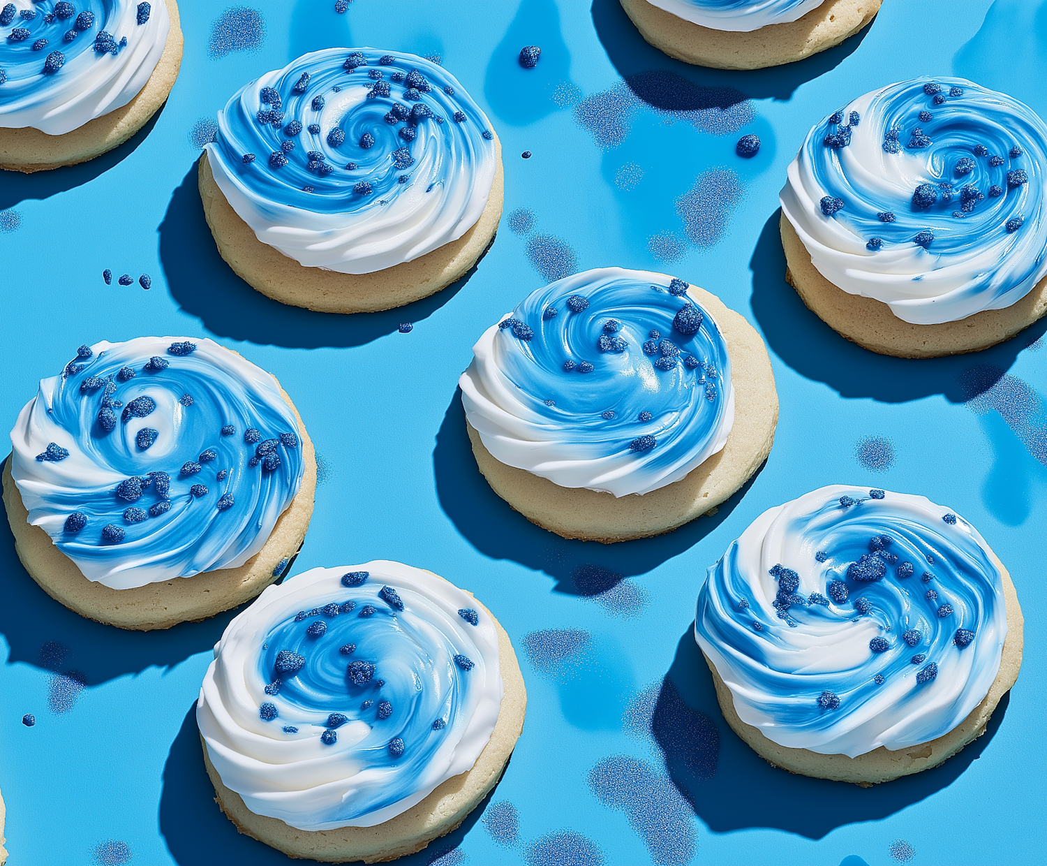 Delicious sugar cookies with blue and white swirled frosting and sprinkles on a vibrant blue background. Perfect for any celebration.