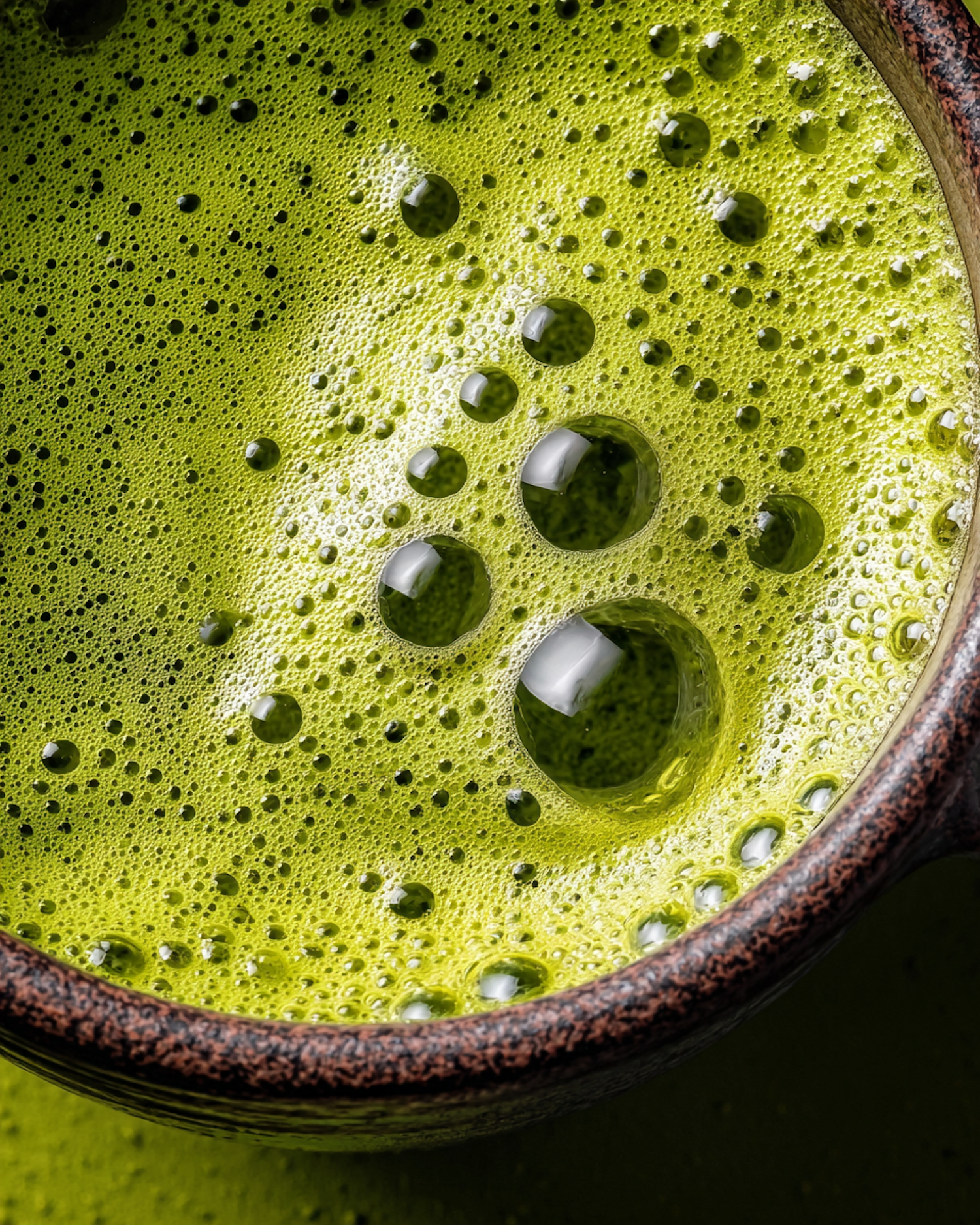 Close-up of a bowl of frothy matcha tea with vibrant green hues and reflective bubbles, showcasing its fresh and natural appeal.