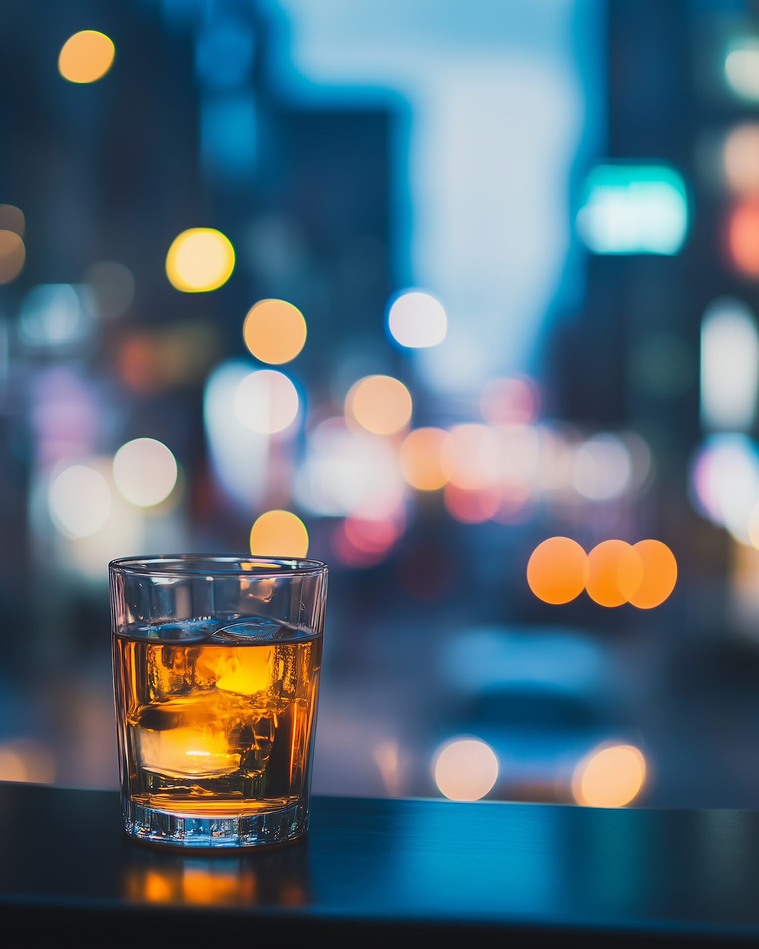 A glass of whiskey with ice on a table, set against a vibrant cityscape with colorful bokeh lights at night.