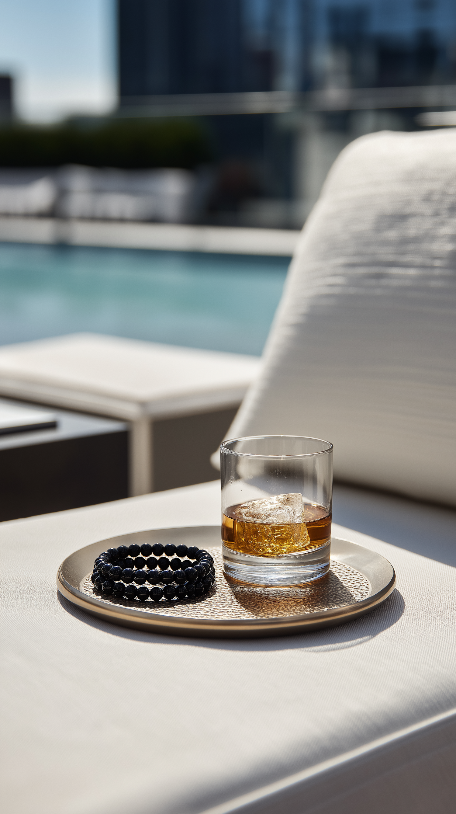 A glass of whiskey with ice and a black beaded bracelet on a golden tray, set on a white lounge chair by a pool in a sunny, modern setting.