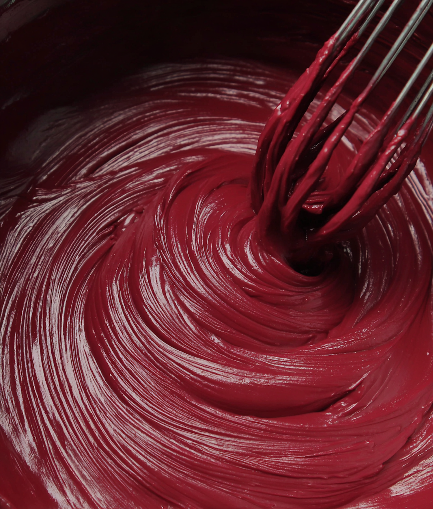 Close-up of a whisk stirring a glossy, deep red batter or frosting, showcasing its smooth texture and vibrant color.