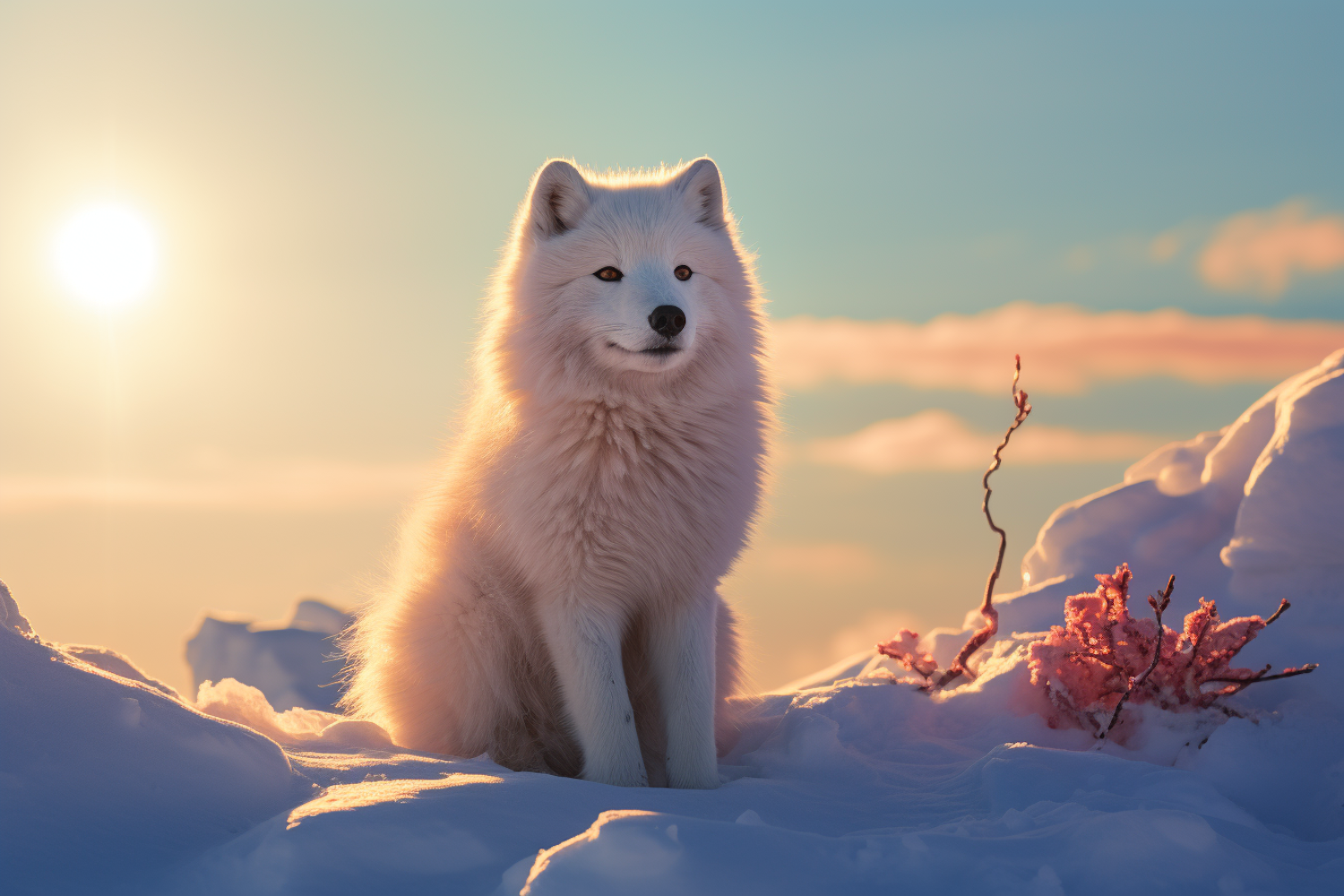 A majestic Arctic fox sits in the snow, illuminated by a golden sunset, with vibrant pink vegetation adding a splash of color.