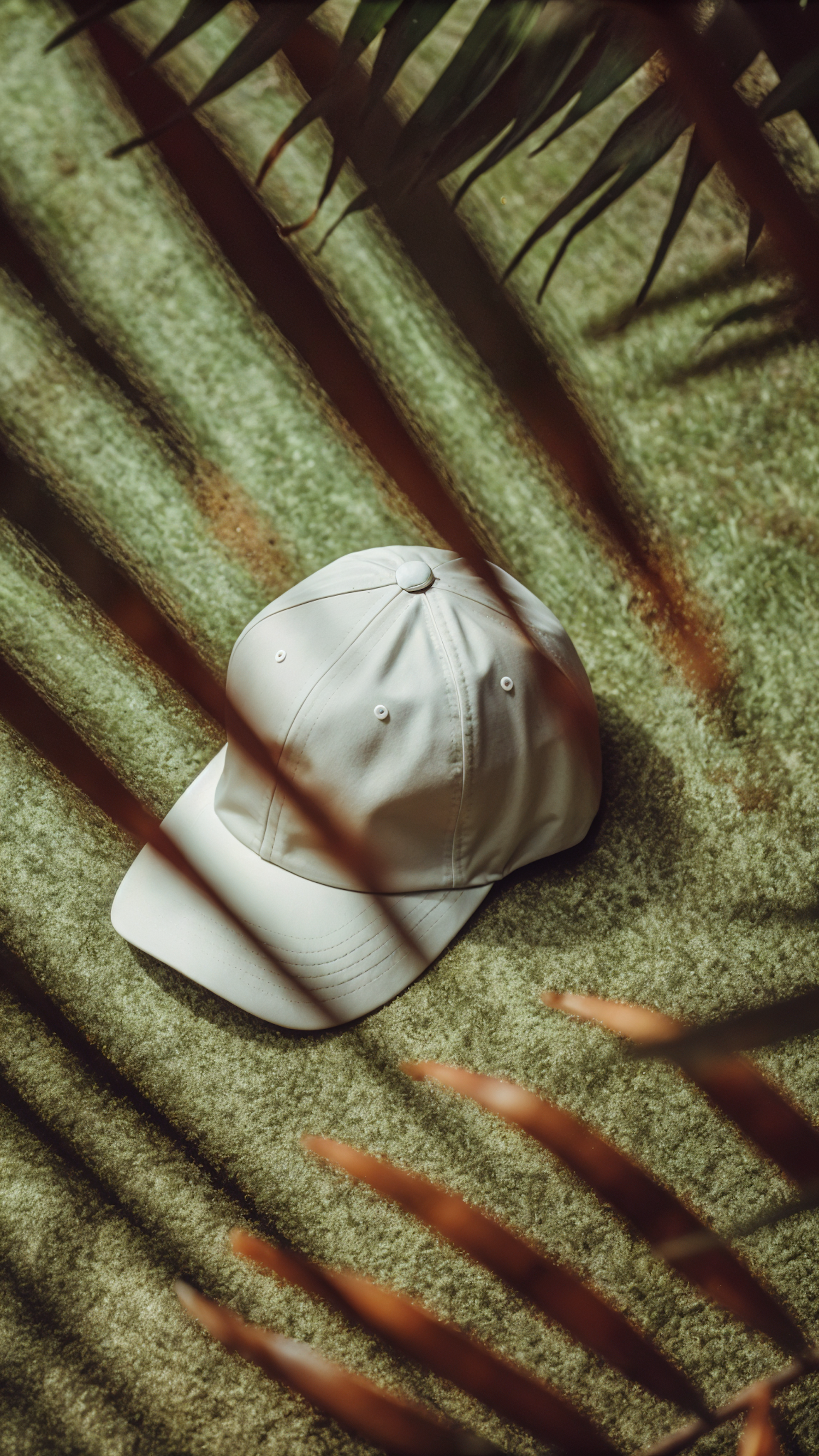 White baseball cap on green surface with palm frond shadows, creating a tropical vibe with contrasting light and dark patterns.