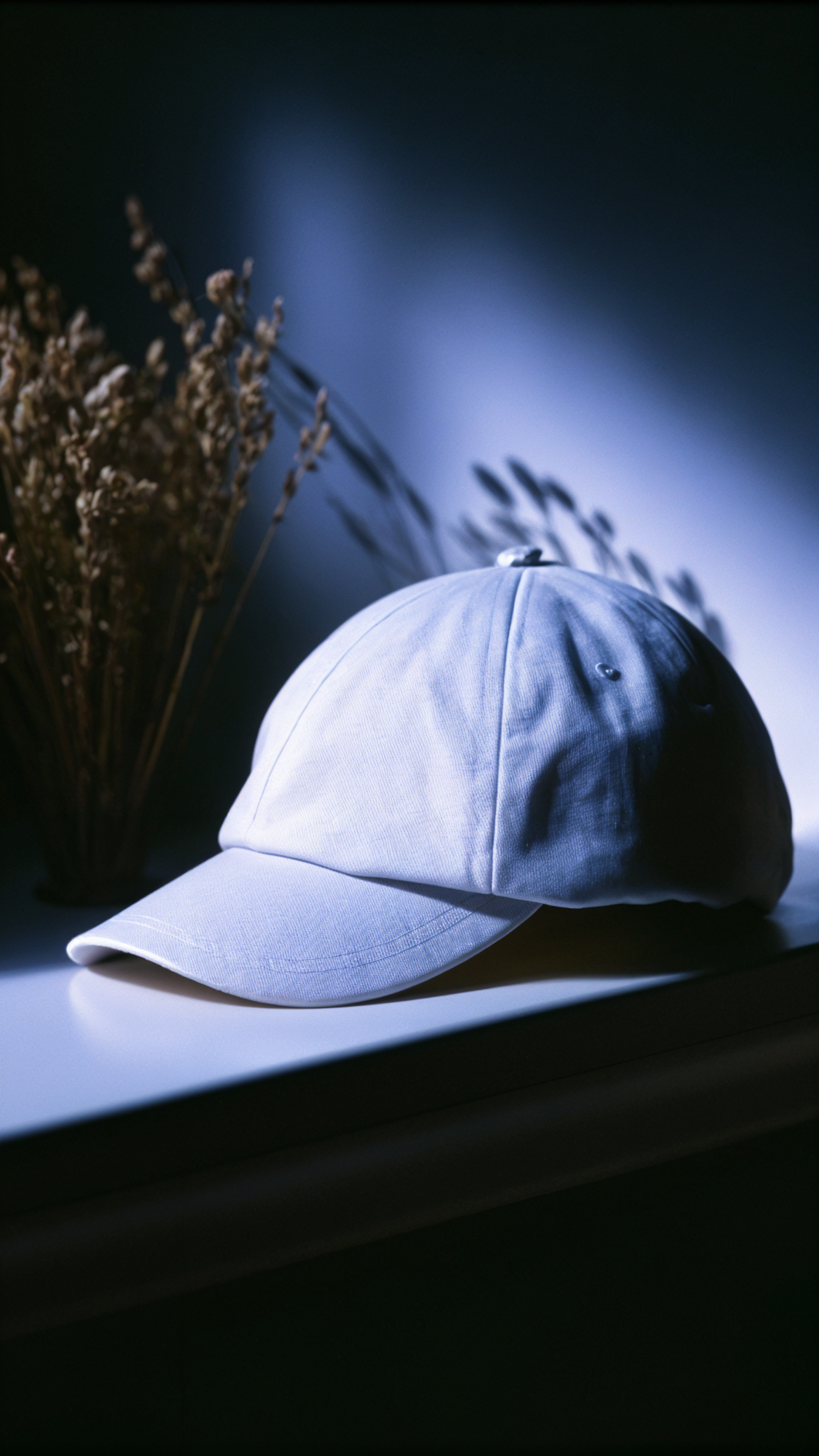 Minimalist photo of a white baseball cap on a white surface, with dried plants and soft lighting creating a serene aesthetic.