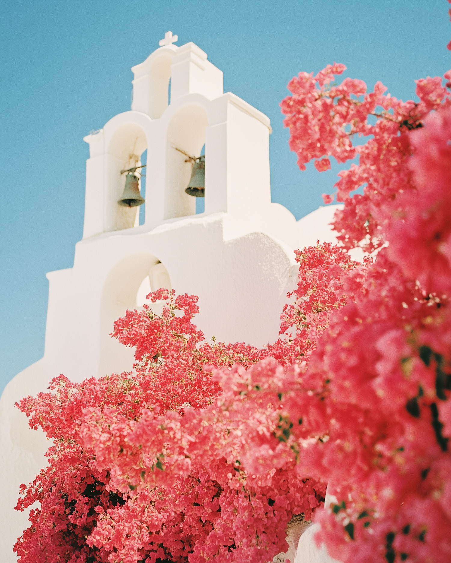 Stunning Greek church with whitewashed walls and vibrant pink bougainvillea against a clear blue sky, capturing Mediterranean charm.
