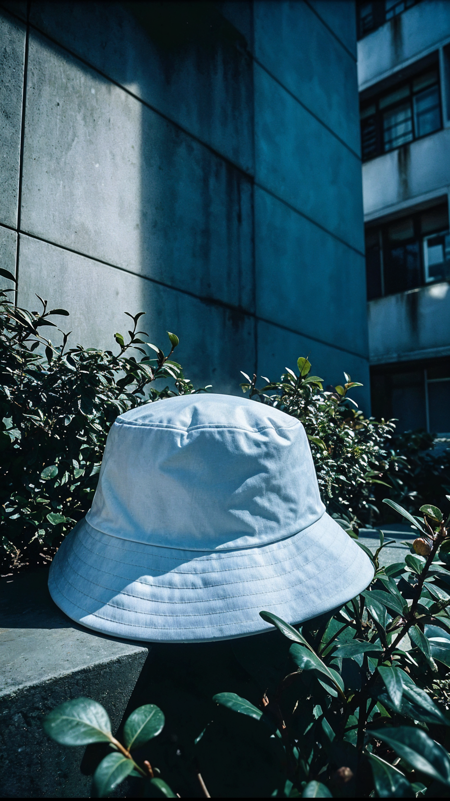 White bucket hat on a concrete ledge with green foliage and urban building backdrop, highlighting nature vs. urban contrast.