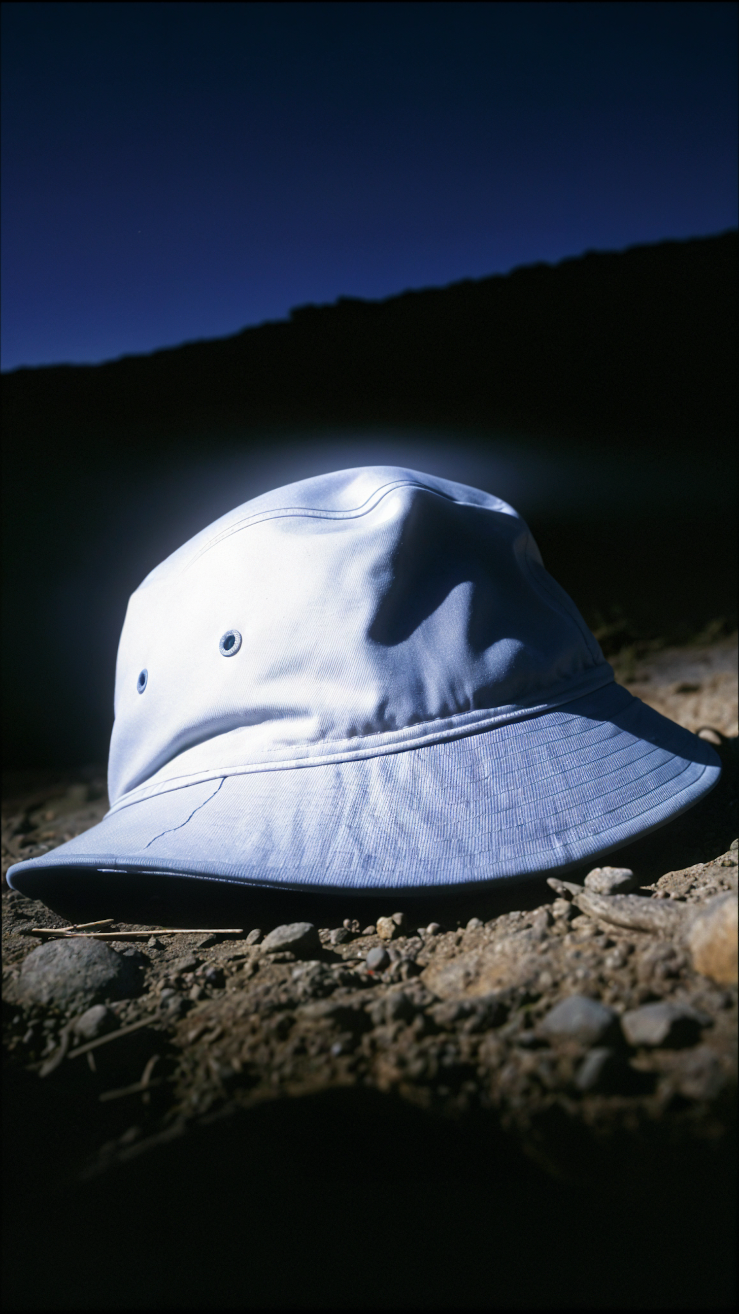 White bucket hat on rocky ground under a dark blue sky, illuminated dramatically, highlighting texture and contrast.