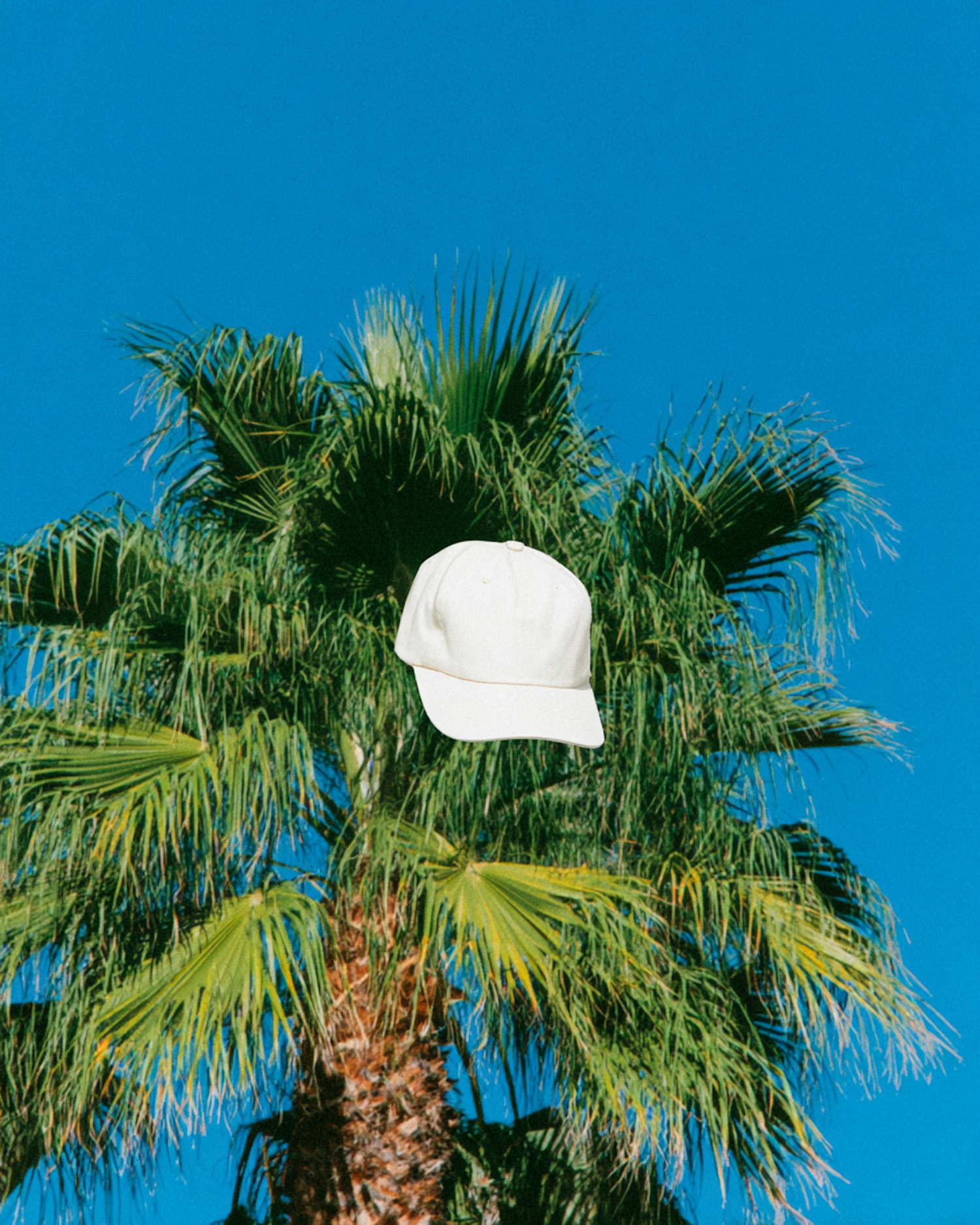 A white baseball cap digitally placed over a lush green palm tree with a bright blue sky in the background. Fun and vibrant composition.