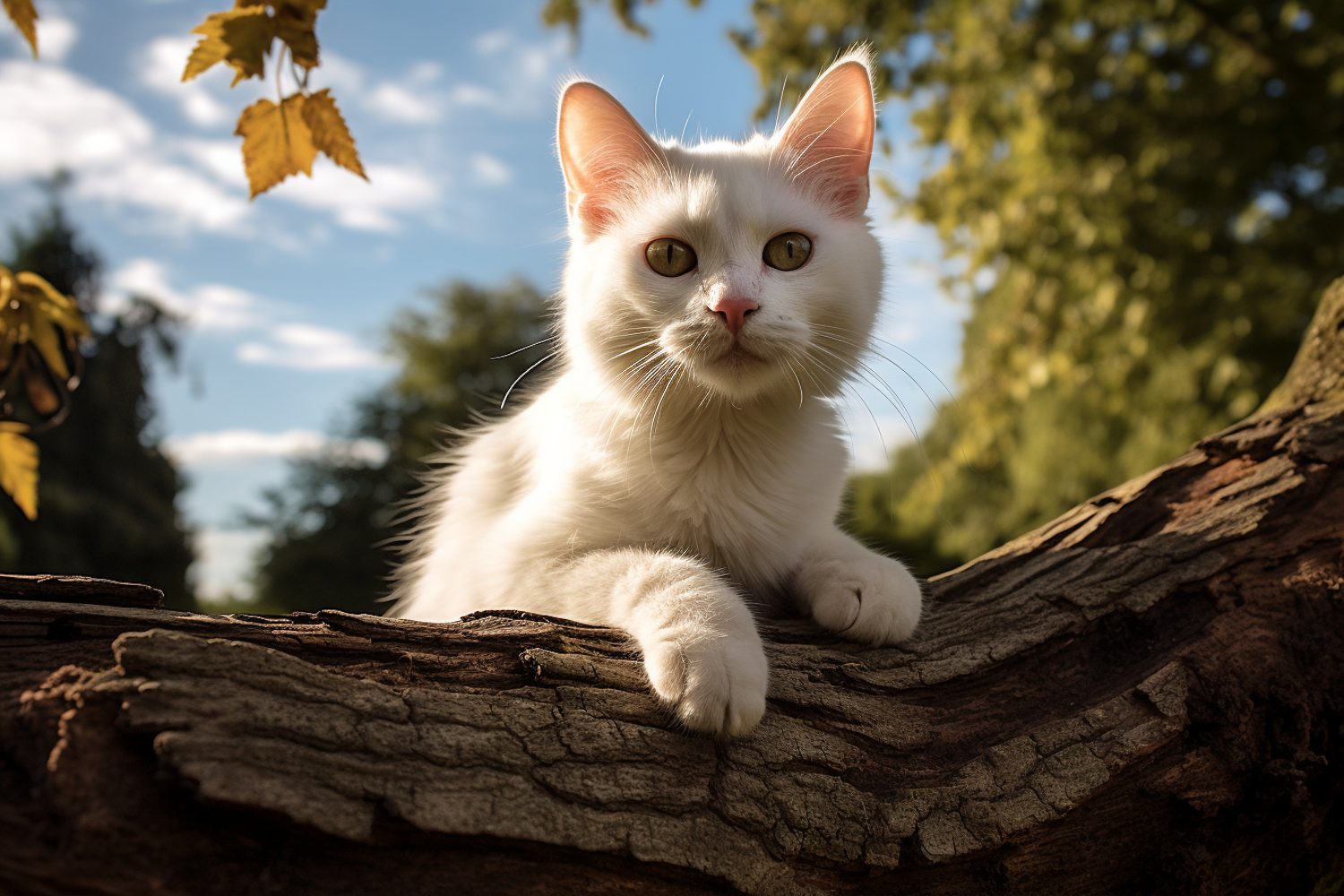 Fluffy white cat with yellow eyes perched on a tree branch, surrounded by green foliage and a clear blue sky.