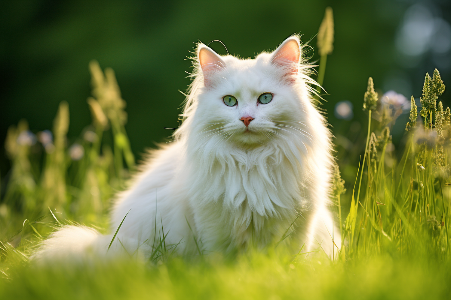 Ethereal Dawn: Majestic White Cat in Lush Green Meadow