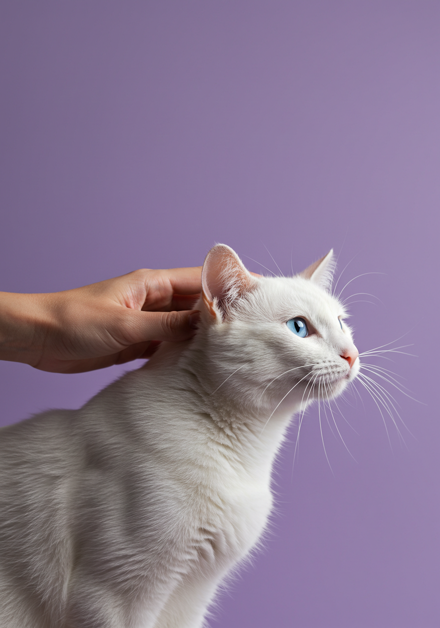 A serene white cat with striking blue eyes being gently petted, set against a calming lavender backdrop.