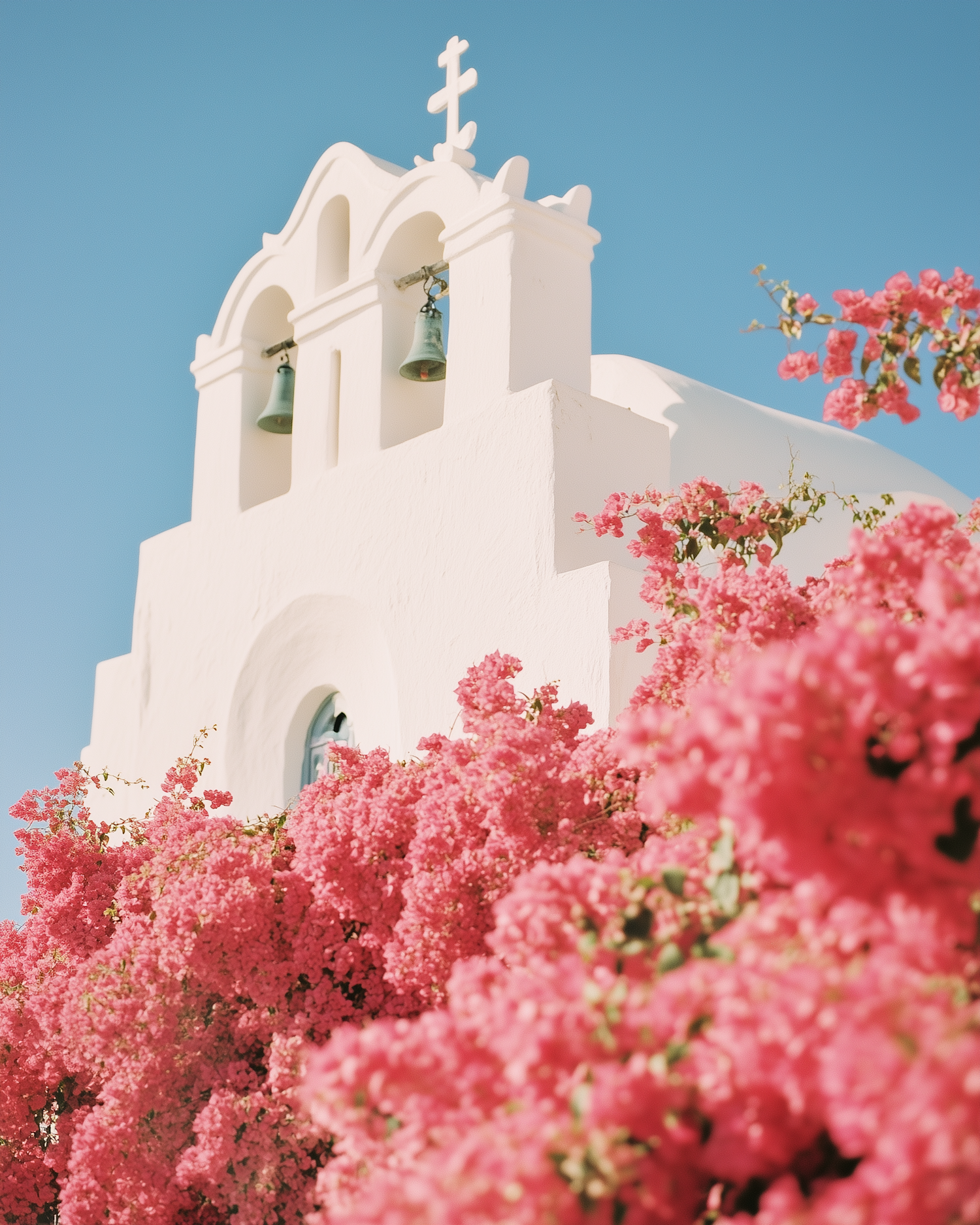 Whitewashed Greek church with pink bougainvillea against a clear blue sky, showcasing Mediterranean charm and vibrant colors.