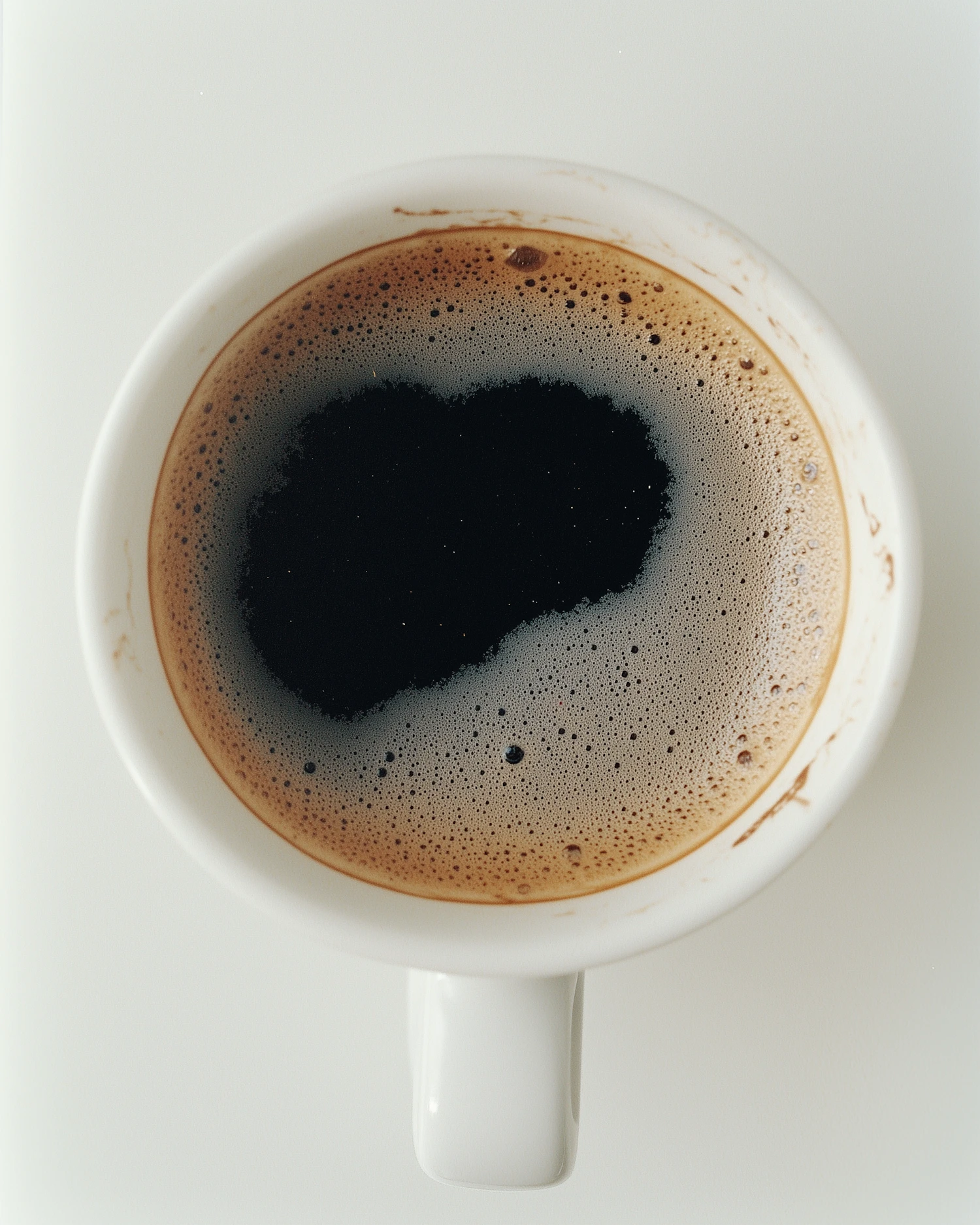 Minimalist close-up of a white coffee cup with black coffee and foam, set against a clean white background.