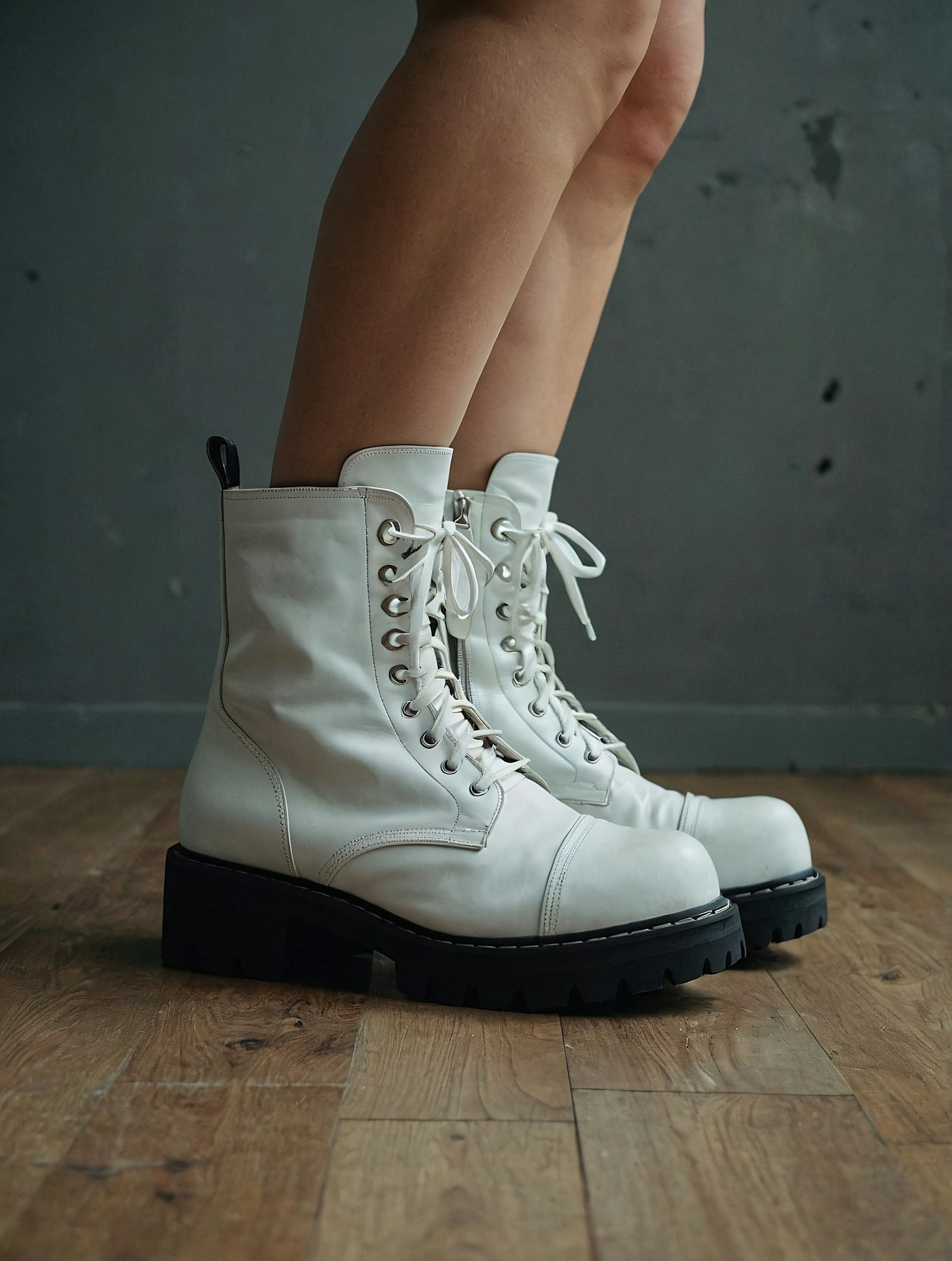 Stylish white combat boots with black lug soles and white laces, worn on a wooden floor with a rustic gray wall in the background.