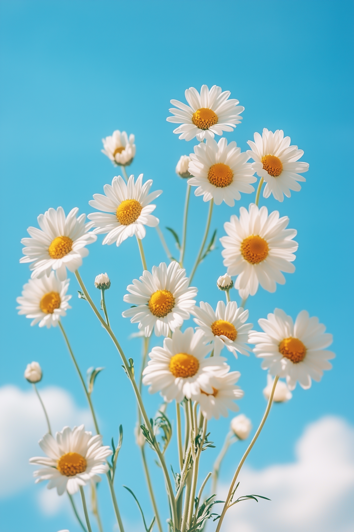 Bright white daisies with yellow centers bloom against a vivid blue sky, creating a cheerful and serene summer vibe.
