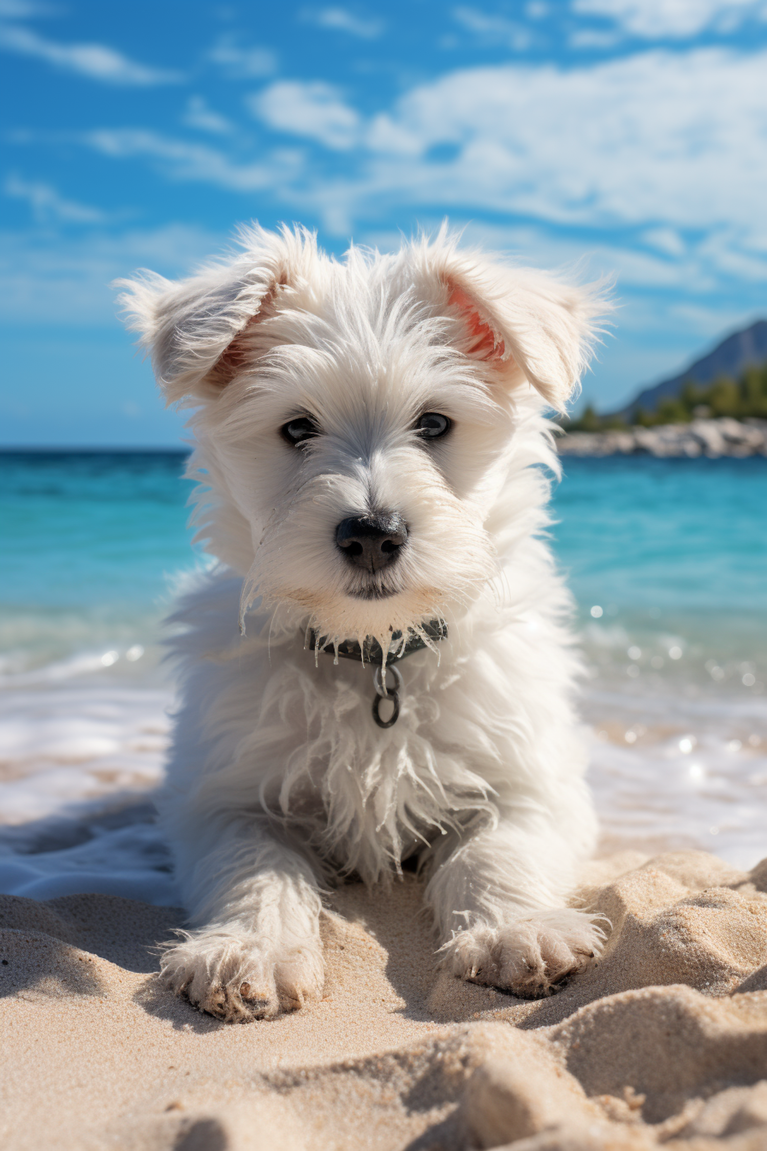 Adorable fluffy white puppy on a sandy beach with turquoise ocean and blue sky, exuding tranquility and playfulness.