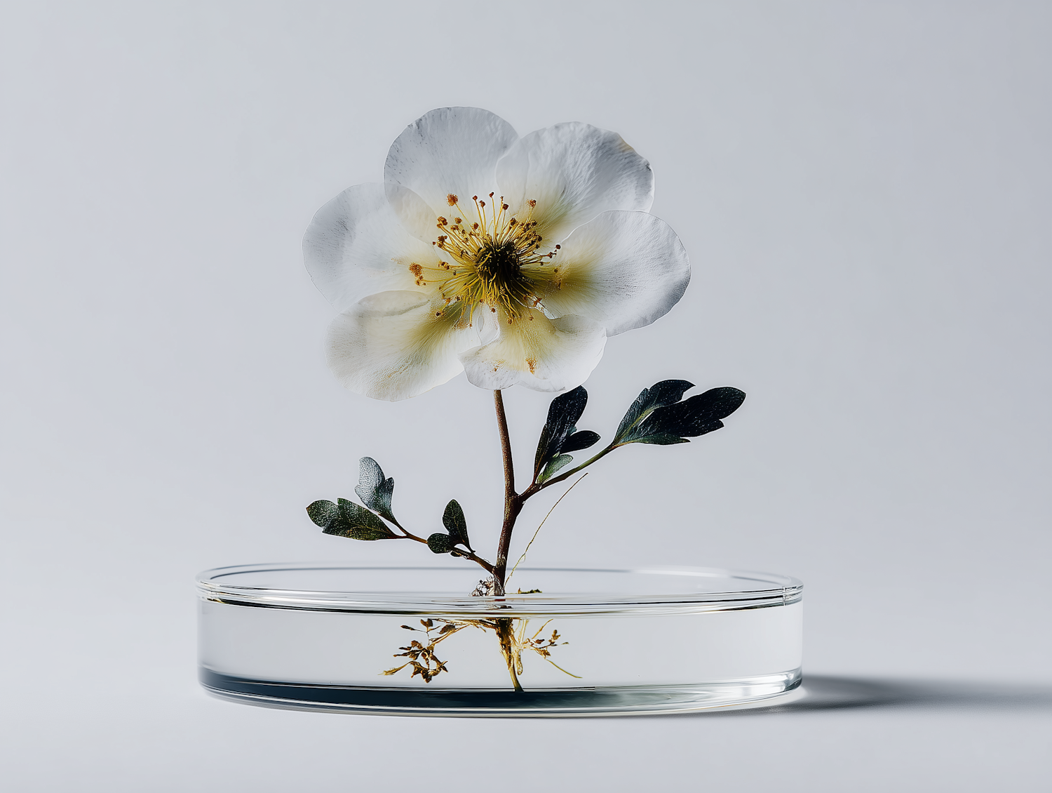 A white flower with a yellow center in a glass dish of water, set against a light gray background, creating a serene and minimalistic scene.
