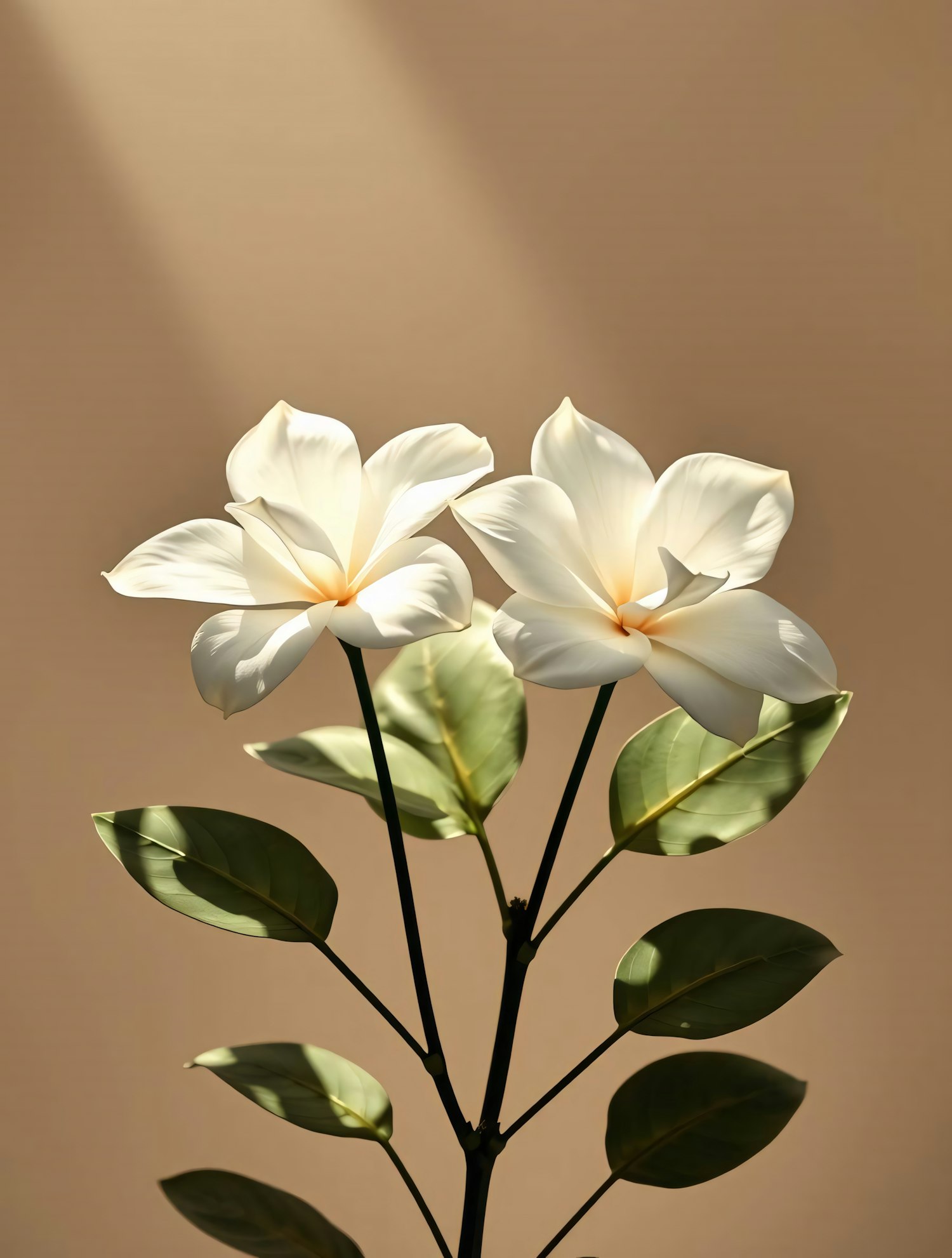 Two white flowers with green leaves on a beige background, beautifully lit to highlight their delicate petals and natural elegance.