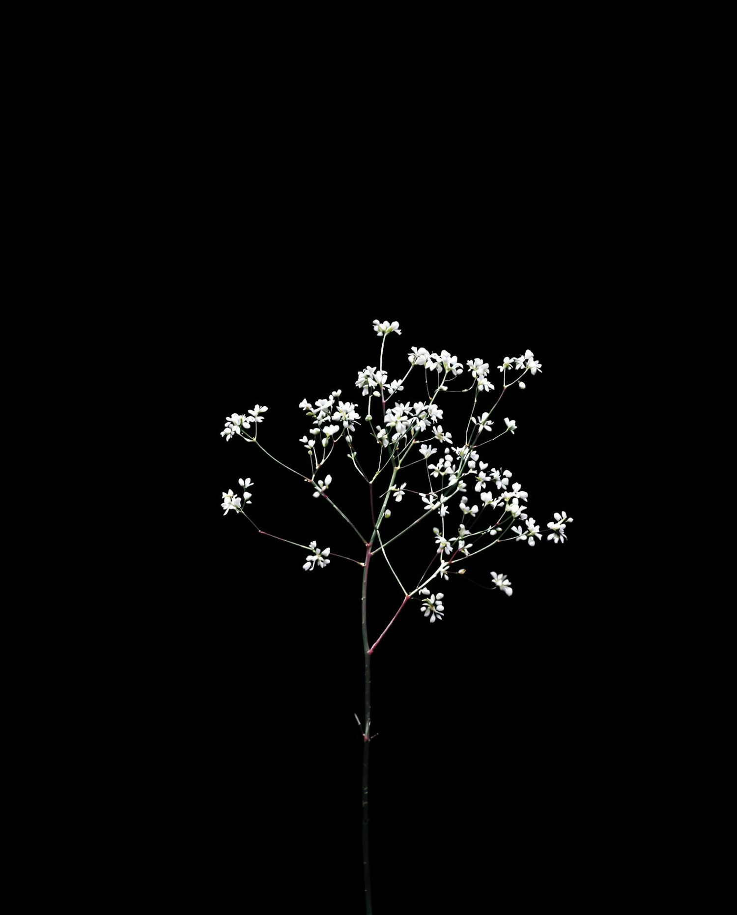 Minimalistic artistic photo of delicate flowers, black background, dramatic lighting, fine art photography, high detail, soft shadows, elegant and moody aesthetic — A minimalist stem of baby’s breath, very delicate and light.