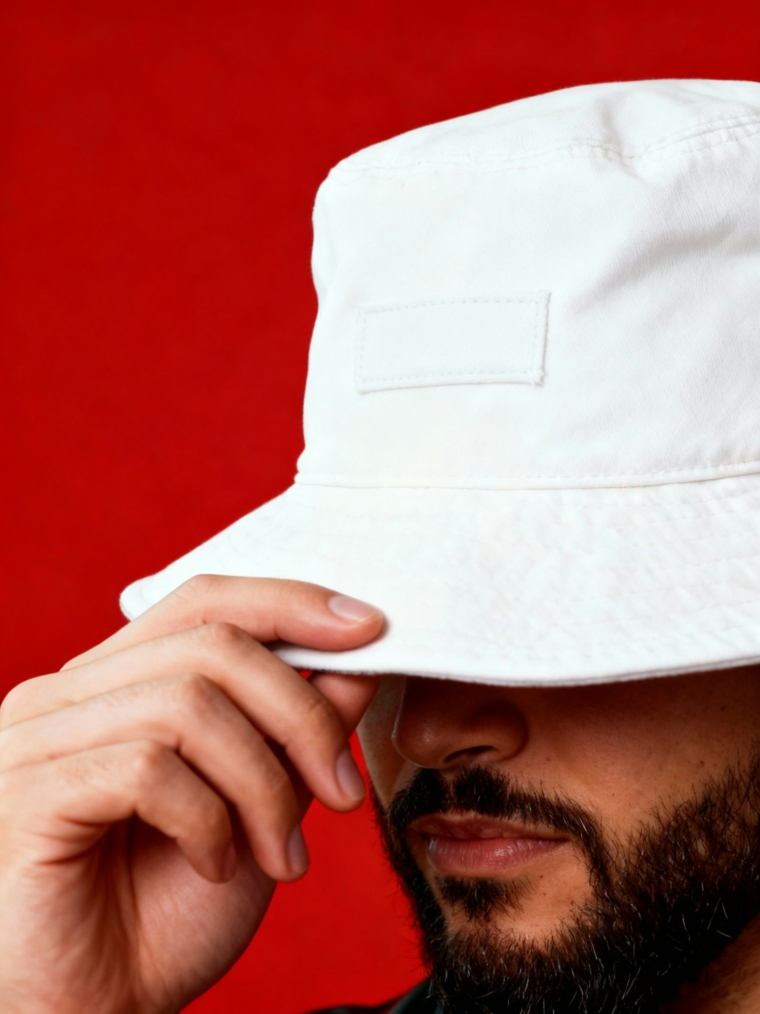 Close-up of a person wearing a white bucket hat, holding its brim, set against a vibrant red background.