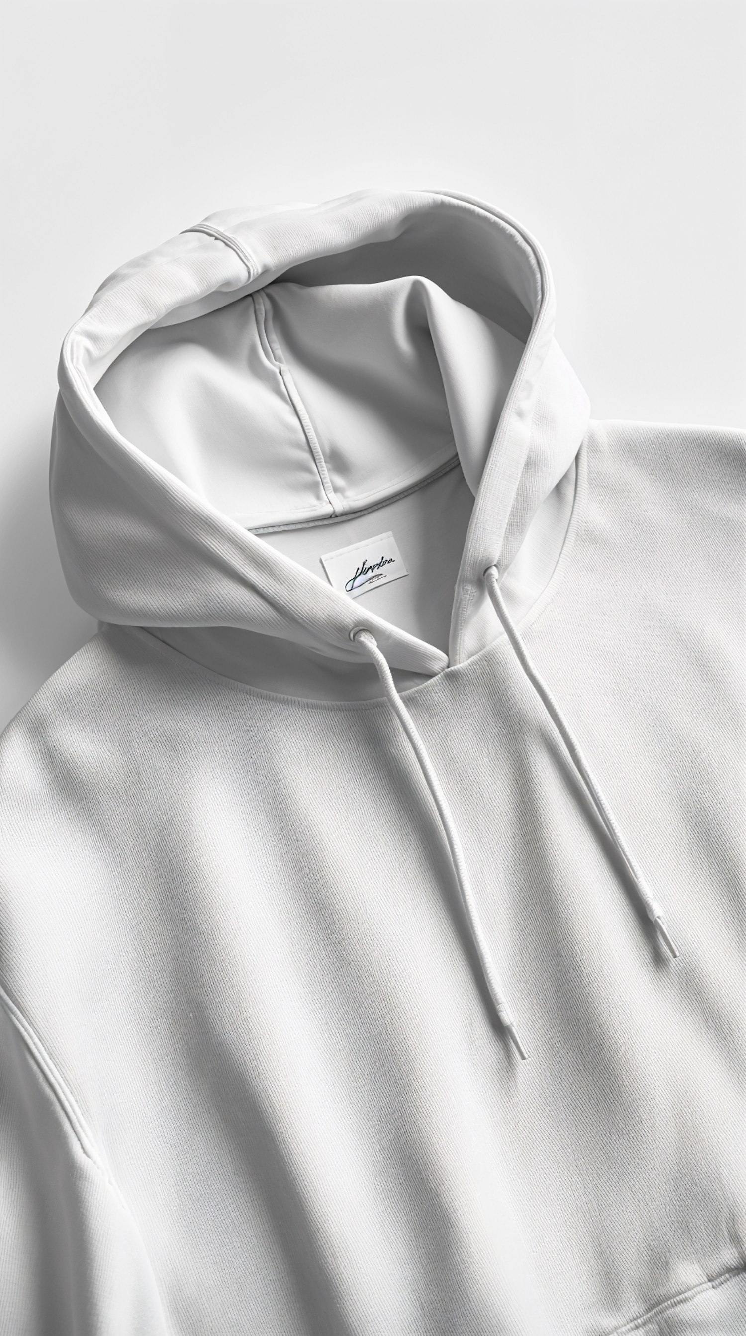 Close-up of a white hoodie with drawstrings and a brand tag, highlighting its soft texture and minimalistic design.