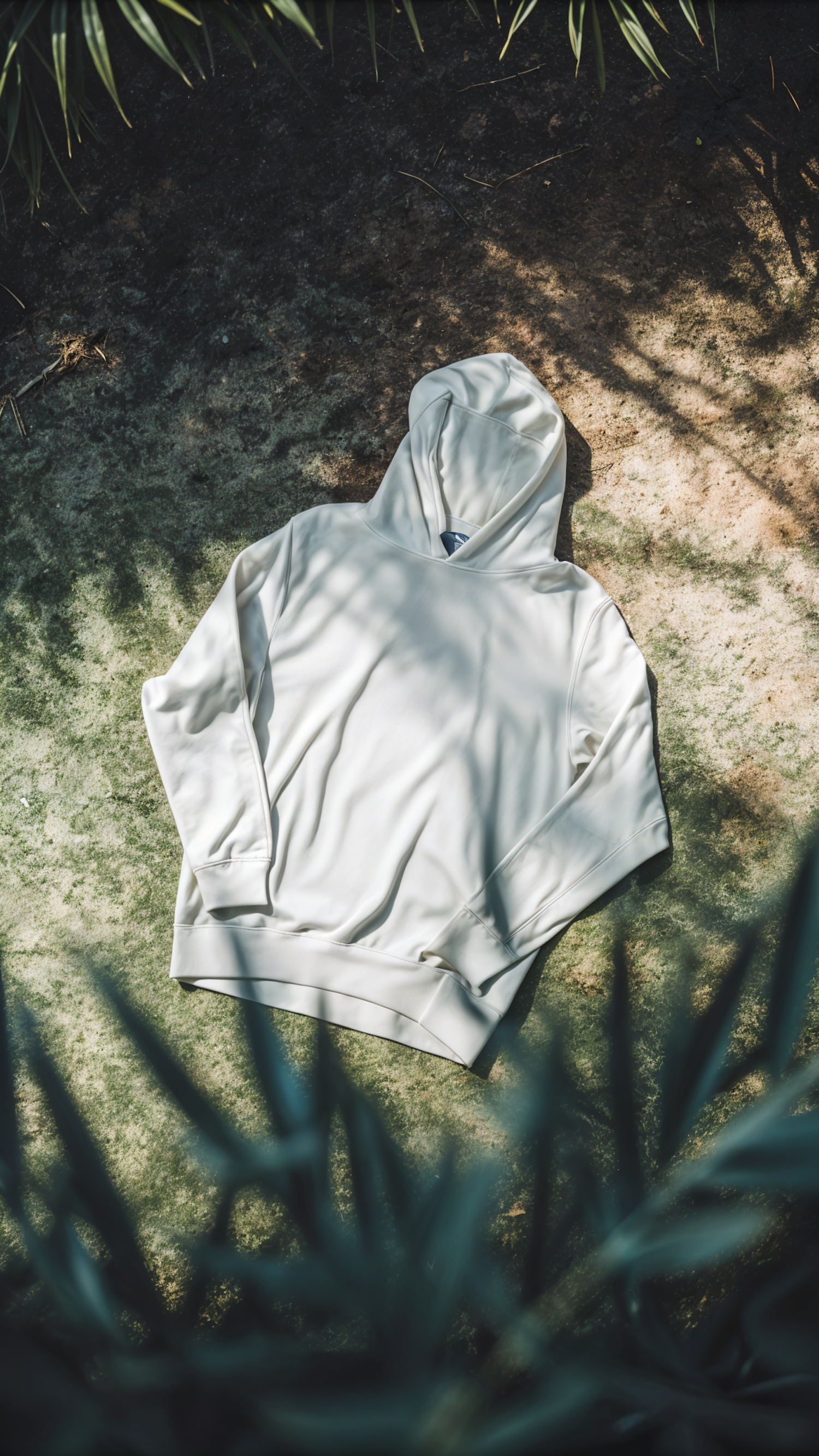 White hoodie on earthy ground with dappled sunlight and foliage shadows, creating a serene and natural atmosphere.
