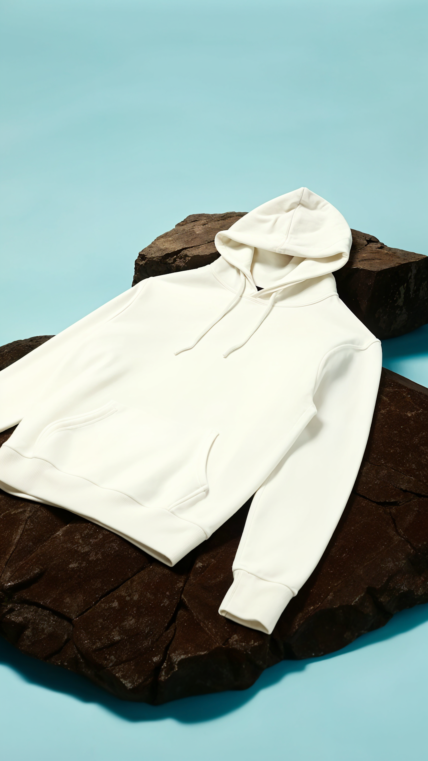 White hoodie on dark rock with light blue background, highlighting minimalist design and contrast.