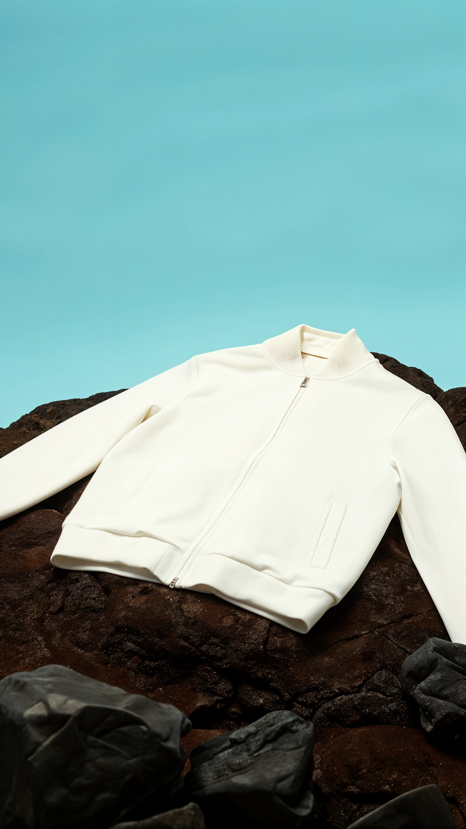 White jacket on rugged rocks with a light blue background, highlighting its minimalist design and contrasting textures.