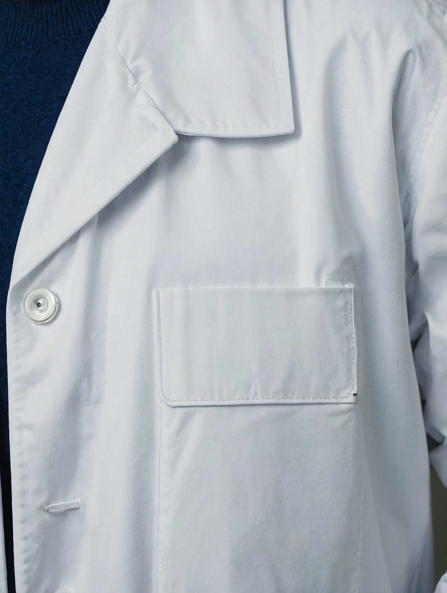 Close-up of a white lab coat with a chest pocket, worn over a dark blue sweater. Crisp fabric and clean stitching details stand out.