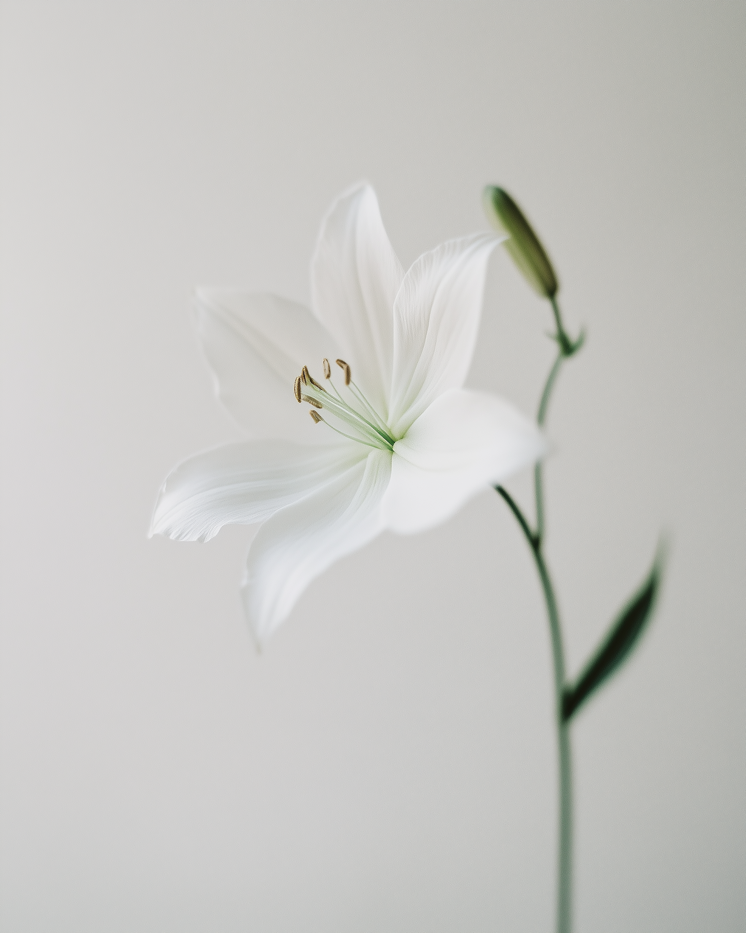 Elegant white lily with delicate petals and golden stamen against a soft background, showcasing minimalist beauty and grace.