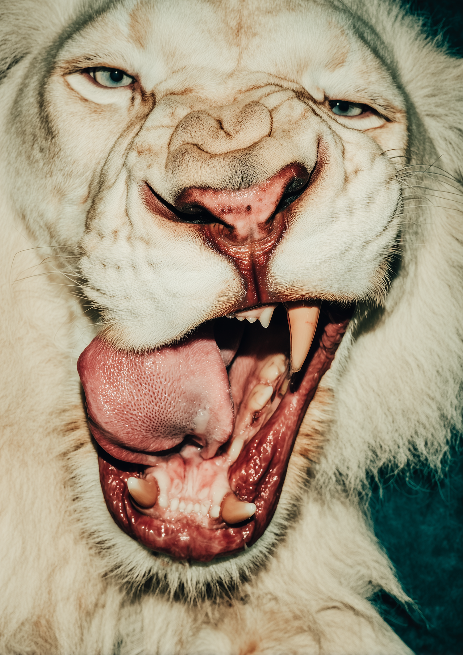 Close-up of a fierce white lion baring teeth, highlighting its details and intense blue eyes.