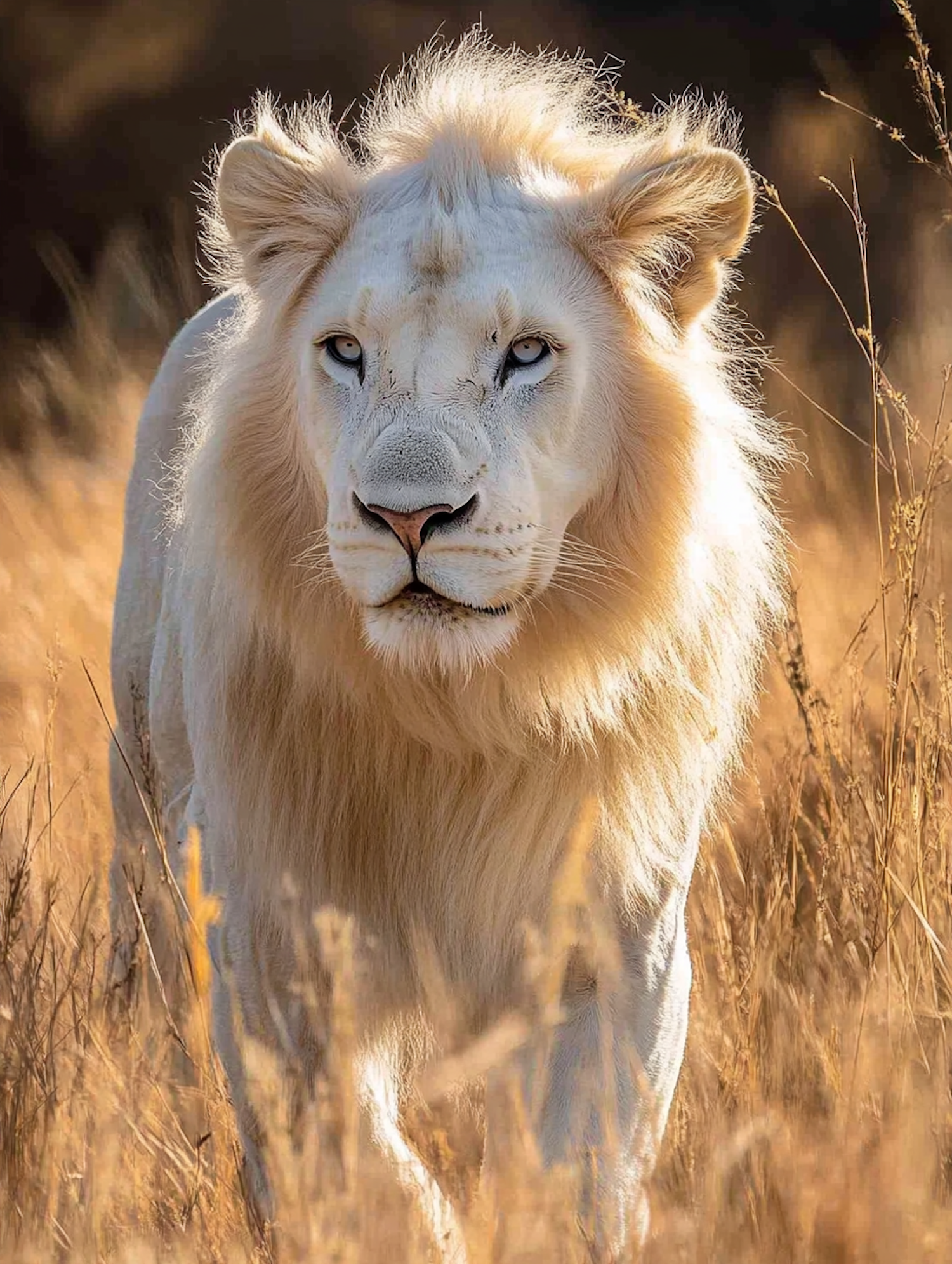 Majestic white lion with piercing blue eyes stands in golden grass, exuding regal beauty and strength.